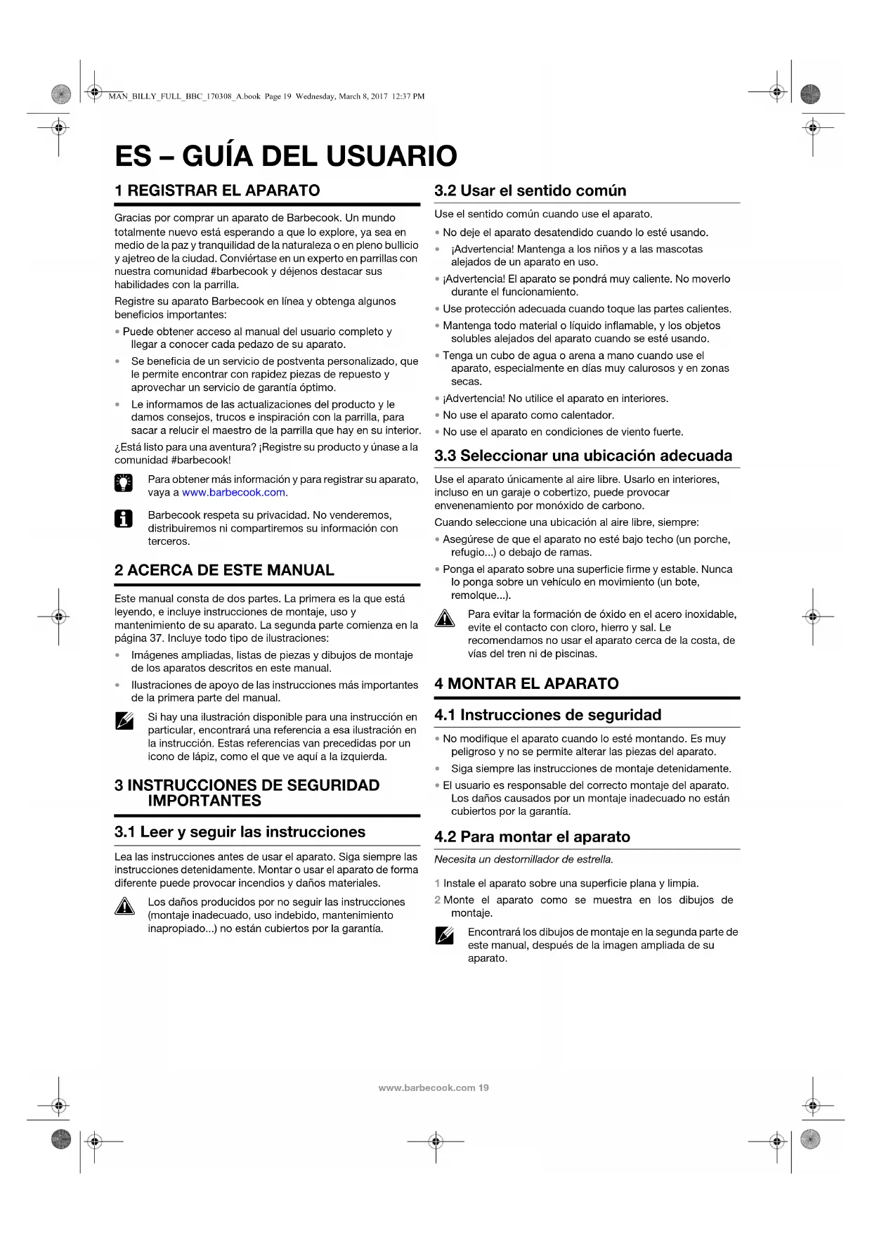 Encontrará los dibujos de montaje en la segunda parte de este manual, después de la imagen ampliada de su aparato. MAN_BILLY_FULL_BBC_170308_A.book Page 19 Wednesday, March 8, 2017 12:37 PM20 www.barbecook.com