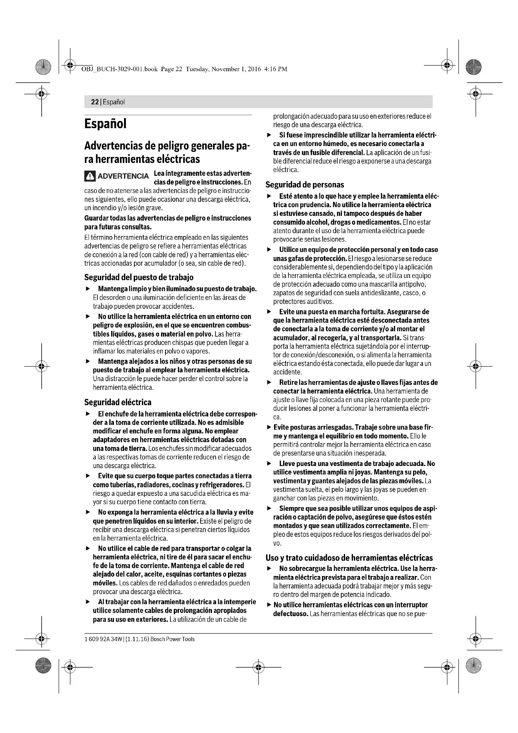 OBJ_BUCH-3029-001.book Page 21 Tuesday, November 1, 2016 4:16 PM22 | Español 1 609 92A 34W | (1.11.16) Bosch Power Tools Español Advertencias de peligro generales pa- ra herramientas eléctricas Lea íntegramente estas adverten- cias de peligro e instrucciones. En caso de no atenerse a las advertencias de peligro e instruccio- nes siguientes, ello puede ocasionar una descarga eléctrica, un incendio y/o lesión grave. Guardar todas las advertencias de peligro e instrucciones para futuras consultas. El término herramienta eléctrica empleado en las siguientes advertencias de peligro se refiere a herramientas eléctricas de conexión a la red (con cable de red) y a herramientas eléc- tricas accionadas por acumulador (o sea, sin cable de red). Seguridad del puesto de trabajo Mantenga limpio y bien iluminado su puesto de trabajo. El desorden o una iluminación deficiente en las áreas de trabajo pueden provocar accidentes. No utilice la herramienta eléctrica en un entorno con peligro de explosión, en el que se encuentren combus- tibles líquidos, gases o material en polvo. Las herra- mientas eléctricas producen chispas que pueden llegar a inflamar los materiales en polvo o vapores. Mantenga alejados a los niños y otras personas de su puesto de trabajo al emplear la herramienta eléctrica. Una distracción le puede hacer perder el control sobre la herramienta eléctrica. Seguridad eléctrica El enchufe de la herramienta eléctrica debe correspon- der a la toma de corriente utilizada. No es admisible modificar el enchufe en forma alguna. No emplear adaptadores en herramientas eléctricas dotadas con una toma de tierra. Los enchufes sin modificar adecuados a las respectivas tomas de corriente reducen el riesgo de una descarga eléctrica. Evite que su cuerpo toque partes conectadas a tierra como tuberías, radiadores, cocinas y refrigeradores. El riesgo a quedar expuesto a una sacudida eléctrica es ma- yor si su cuerpo tiene contacto con tierra. No exponga la herramienta eléctrica a la lluvia y evite que penetren líquidos en su interior. Existe el peligro de recibir una descarga eléctrica si penetran ciertos líquidos en la herramienta eléctrica. No utilice el cable de red para transportar o colgar la herramienta eléctrica, ni tire de él para sacar el enchu- fe de la toma de corriente. Mantenga el cable de red alejado del calor, aceite, esquinas cortantes o piezas móviles. Los cables de red dañados o enredados pueden provocar una descarga eléctrica. Al trabajar con la herramienta eléctrica a la intemperie utilice solamente cables de prolongación apropiados para su uso en exteriores. La utilización de un cable de prolongación adecuado para su uso en exteriores reduce el riesgo de una descarga eléctrica. Si fuese imprescindible utilizar la herramienta eléctri- ca en un entorno húmedo, es necesario conectarla a través de un fusible diferencial. La aplicación de un fusi- ble diferencial reduce el riesgo a exponerse a una descarga eléctrica. Seguridad de personas Esté atento a lo que hace y emplee la herramienta eléc- trica con prudencia. No utilice la herramienta eléctrica si estuviese cansado, ni tampoco después de haber consumido alcohol, drogas o medicamentos. El no estar atento durante el uso de la herramienta eléctrica puede provocarle serias lesiones. Utilice un equipo de protección personal y en todo caso unas gafas de protección. El riesgo a lesionarse se reduce considerablemente si, dependiendo del tipo y la aplicación de la herramienta eléctrica empleada, se utiliza un equipo de protección adecuado como una mascarilla antipolvo, zapatos de seguridad con suela antideslizante, casco, o protectores auditivos. Evite una puesta en marcha fortuita. Asegurarse de que la herramienta eléctrica esté desconectada antes de conectarla a la toma de corriente y/o al montar el acumulador, al recogerla, y al transportarla. Si trans- porta la herramienta eléctrica sujetándola por el interrup- tor de conexión/desconexión, o si alimenta la herramienta eléctrica estando ésta conectada, ello puede dar lugar a un accidente. Retire las herramientas de ajuste o llaves fijas antes de conectar la herramienta eléctrica. Una herramienta de ajuste o llave fija colocada en una pieza rotante puede pro- ducir lesiones al poner a funcionar la herramienta eléctri- ca. Evite posturas arriesgadas. Trabaje sobre una base fir- me y mantenga el equilibrio en todo momento. Ello le permitirá controlar mejor la herramienta eléctrica en caso de presentarse una situación inesperada. Lleve puesta una vestimenta de trabajo adecuada. No utilice vestimenta amplia ni joyas. Mantenga su pelo, vestimenta y guantes alejados de las piezas móviles. La vestimenta suelta, el pelo largo y las joyas se pueden en- ganchar con las piezas en movimiento. Siempre que sea posible utilizar unos equipos de aspi- ración o captación de polvo, asegúrese que éstos estén montados y que sean utilizados correctamente. El em- pleo de estos equipos reduce los riesgos derivados del pol- vo. Uso y trato cuidadoso de herramientas eléctricas No sobrecargue la herramienta eléctrica. Use la herra- mienta eléctrica prevista para el trabajo a realizar. Con la herramienta adecuada podrá trabajar mejor y más segu- ro dentro del margen de potencia indicado. No utilice herramientas eléctricas con un interruptor defectuoso. Las herramientas eléctricas que no se pue- ADVERTENCIA OBJ_BUCH-3029-001.book Page 22 Tuesday, November 1, 2016 4:16 PMEspañol | 23 Bosch Power Tools 1 609 92A 34W | (1.11.16) dan conectar o desconectar son peligrosas y deben hacer- se reparar. Saque el enchufe de la red y/o desmonte el acumulador antes de realizar un ajuste en la herramienta eléctrica, cambiar de accesorio o al guardar la herramienta eléc- trica. Esta medida preventiva reduce el riesgo a conectar accidentalmente la herramienta eléctrica. Guarde las herramientas eléctricas fuera del alcance de los niños. No permita la uti