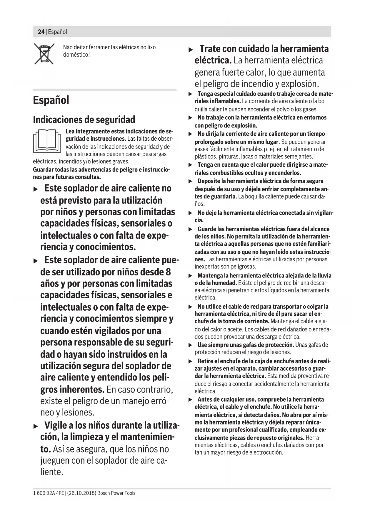 50 150 – Enfriar pieza de trabajo – Secar pintura 1 250 350 Conformación de tubos de plás- tico 2 350 400 Soldadura de plásticos 3 450 500 Eliminar pintura 4 550 400 Soldadura con estaño A) no se indica en el visualizador Para solicitar una combinación, presione la tecla de memori- zación (11) varias veces, hasta que aparezca el número de- seado en el indicador (5). Memorice su propia combinación: – Presione la tecla de memorización (11) para seleccionar el espacio de memoria deseado. – Ajuste la temperatura y el caudal de aire deseado. El es- pacio de memoria (5) parpadea para indicar, que se ha modificado la combinación memorizada. – Presione y mantenga presionada la tecla de memoriza- ción (11). El espacio de memoria (5) parpadea durante aprox. 2segundos. Tan pronto como se ilumina perma- nentemente, se ha memorizado la nueva combinación. Instrucciones para la operación u Antes de cualquier manipulación en la herramienta eléctrica, sacar el enchufe de red de la toma de co- rriente. Indicación: No acerque demasiado la boquilla(1) a la pieza de trabajo a mecanizar. El estancamiento de aire resultante puede llegar a sobrecalentar la herramienta eléctrica. Desmontaje de la protección térmica Para los trabajos en lugares muy estrechos se puede quitar la protección térmica(2) girándola. Bosch Power Tools 1 609 92A 4RE | (26.10.2018)28 | Español u ¡Cuidado con la boquilla caliente! Al trabajar sin la pro- tección térmica existe un mayor peligro de quemadura. Para quitar o colocar la protección térmica(2) desconecte la herramienta eléctrica y déjela que se enfríe. Para que se refrigere más rápidamente, Ud. puede dejar fun- cionar brevemente la herramienta eléctrica ajustando la tem- peratura mínima posible. Deposición de la herramienta eléctrica Coloque la herramienta eléctrica sobre las superficies porta- objetos(3), para permitir que se enfríe o para tener ambas manos libres para trabajar. u ¡Tenga especial cuidado con la herramienta eléctrica depositada! Podría quemarse con la boquilla o el aire ca- liente expulsado. Coloque la herramienta eléctrica en una superficie plana y estable. Asegúrese de que no pueda volcarse. Asegure el ca- ble fuera de su área de trabajo para que no pueda dar vuelta o tirar hacia abajo la herramienta eléctrica. En caso de no utilizar la herramienta eléctrica durante un tiempo prolongado, desconéctela y extraiga el enchufe de red. Ejemplos para el trabajo (ver figurasA–G) Las figuras correspondientes a los ejemplos de trabajo las encontrará en las páginas ilustradas. La distancia de la boquilla a la pieza de trabajo es depen- diente del material a trabajar (metal, plástico, etc.) y el me- canizado proyectado. La temperatura óptima para la respectiva aplicación puede determinarse mediante un experimento práctico. Efectúe siempre primero una prueba respecto al caudal de aire y la temperatura. Comience con una mayor distancia y un nivel bajo de potencia. A continuación, ajuste la distancia y el nivel de potencia según sea necesario. Si no está seguro, cual es el material que está trabajando o cómo es el efecto del soplador de aire caliente sobre el ma- terial, pruebe el efecto en un lugar oculto. Puede trabajar sin accesorios en todos los ejemplos de tra- bajo excepto "Eliminar pintura de marcos de ventana". Sin embargo, al emplear los accesorios especiales propuestos, la ejecución del trabajo se simplifica y se aumenta conside- rablemente su calidad. u ¡Tenga cuidado al cambiar las boquillas! No toque la boquilla caliente.Permita que la herramienta eléctrica se enfríe y use guantes de protección al realizar el cambio. Podría quemarse con la boquilla caliente. Para que se refrigere más rápidamente, Ud. puede dejar fun- cionar brevemente la herramienta eléctrica ajustando la tem- peratura mínima posible. Decapado de pintura/desprendimiento de adhesivo (ver figura A) Coloque la boquilla plana (14) (accesorio). Ablande la pintu- ra brevemente con aire caliente y despéguela con una espá- tula limpia. Una acción de calor prolongada quema la pintura y dificulta la eliminación. Muchos adhesivos se ablandan por la acción de calor. Si el pegamento está caliente, puede separar las uniones adhesi- vas o eliminar el exceso de pegamento. Eliminar pintura de marcos de ventanas (verfiguraB) u Utilice imprescindiblemente la boquilla de protección de vidrio(15) (accesorio). Existe el peligro de que rom- pa el cristal. En superficies perfiladas puede levantarse la pintura con una espátula adecuada y desprenderse con un cepillo de alam- bre blando. Descongelación de tuberías de agua (verfiguraC) u Compruebe antes del calentamiento, si se trata real- mente de una tubería de agua. Con frecuencia no es po- sible diferenciar exteriormente entre tuberías de gas y de agua. Jamás deberán calentarse tuberías de gas. Coloque la boquilla angular (16) (accesorio). Preferiblemen- te, caliente las zonas congeladas desde el desagüe hacia la afluencia. Caliente con especial cuidado los tubos de plástico y las uniones de los tubos, para no dañarlos. Conformación de tubos de plástico (ver figuraD) Coloque la boquilla reflectora (17) (accesorio). Llene los tu- bos de plástico con arena y obtúrelos en ambos lados para evitar una dobladura del tubo. Caliente el tubo con cuidado y uniforme moviéndolo lateralmente en ambos sentidos. Soldadura de plásticos (ver figuraE) Coloque la boquilla reductora (20) y la zapata de soldadu- ra(19) (ambos accesorios). La piezas de trabajo a soldar y el alambre para soldar(18) (accesorio) deben ser del mismo material (p. ej. ambos PVC). La junta de unión deberá estar limpia y exenta de grasa. Caliente con cuidado la junta hasta que comience a ponerse pastosa. Tenga en cuenta que el margen de temperatura en- tre el estado pastoso y líquido de un plástico es bastante re- ducido. Alimente el alambre para soldar(18) y déjelo entrar en el in- tersticio, para que se fo