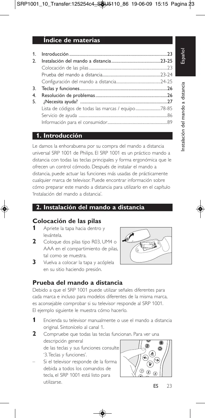 Instalación del mando a distancia23-25 Colocación de las pilas 23 Prueba del mando a distancia23-24 Configuración del mando a distancia24-25 Teclas y funciones26 Resolución de problemas 26 ¿Necesita ayuda? 27 Lista de códigos de todas las marcas / equipo78-85 Servicio de ayuda 86 Información para el consumidor89