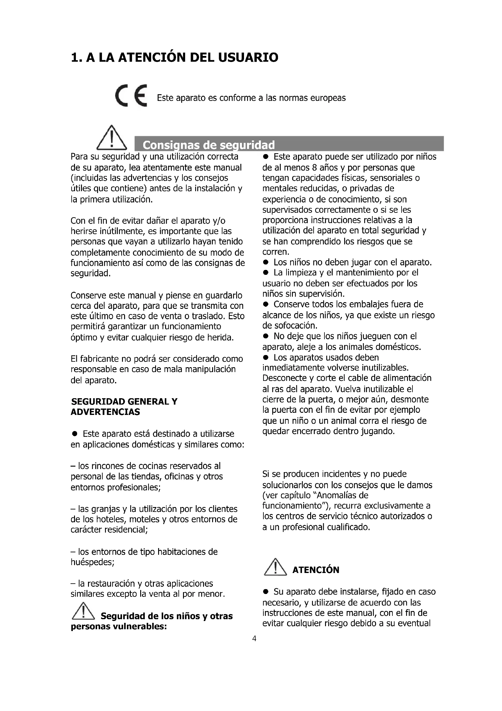 Este aparato es conforme a las normas europeas Consignas de seguridad Para su seguridad y una utilización correcta de su aparato, lea atentamente este manual (incluidas las advertencias y los consejos útiles que contiene) antes de la instalación y la primera utilización. Con el fin de evitar dañar el aparato y/o herirse inútilmente, es importante que las personas que vayan a utilizarlo hayan tenido completamente conocimiento de su modo de funcionamiento así como de las consignas de seguridad. Conserve este manual y piense en guardarlo cerca del aparato, para que se transmita con este último en caso de venta o traslado. Esto permitirá garantizar un funcionamiento óptimo y evitar cualquier riesgo de herida. El fabricante no podrá ser considerado como responsable en caso de mala manipulación del aparato.