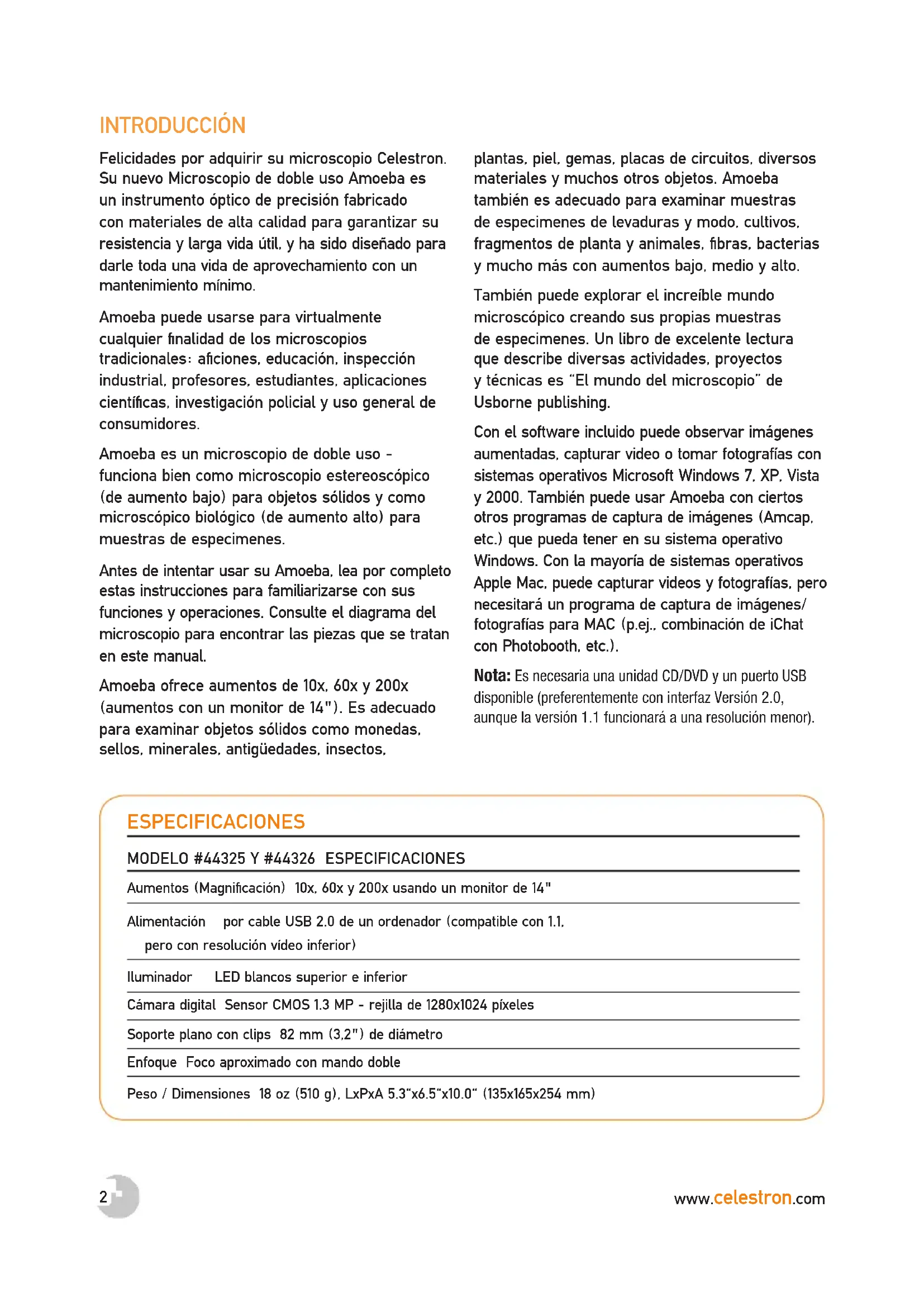 Digital Microscope de doble usowww.celestron.com INTRODUCCIÓN Felicidades por adquirir su microscopio Celestron. Su nuevo Microscopio de doble uso Amoeba es un instrumento óptico de precisión fabricado con materiales de alta calidad para garantizar su resistencia y larga vida útil, y ha sido diseñado para darle toda una vida de aprovechamiento con un mantenimiento mínimo. Amoeba puede usarse para virtualmente cualquier finalidad de los microscopios tradicionales: aficiones, educación, inspección industrial, profesores, estudiantes, aplicaciones científicas, investigación policial y uso general de consumidores. Amoeba es un microscopio de doble uso - funciona bien como microscopio estereoscópico (de aumento bajo) para objetos sólidos y como microscópico biológico (de aumento alto) para muestras de especimenes. Antes de intentar usar su Amoeba, lea por completo estas instrucciones para familiarizarse con sus funciones y operaciones. Consulte el diagrama del microscopio para encontrar las piezas que se tratan en este manual. Amoeba ofrece aumentos de 10x, 60x y 200x (aumentos con un monitor de 14"). Es adecuado para examinar objetos sólidos como monedas, sellos, minerales, antigüedades, insectos, plantas, piel, gemas, placas de circuitos, diversos materiales y muchos otros objetos. Amoeba también es adecuado para examinar muestras de especimenes de levaduras y modo, cultivos, fragmentos de planta y animales, fibras, bacterias y mucho más con aumentos bajo, medio y alto. También puede explorar el increíble mundo microscópico creando sus propias muestras de especimenes. Un libro de excelente lectura que describe diversas actividades, proyectos y técnicas es “El mundo del microscopio” de Usborne publishing. Con el software incluido puede observar imágenes aumentadas, capturar video o tomar fotografías con sistemas operativos Microsoft Windows 7, XP, Vista y 2000. También puede usar Amoeba con ciertos otros programas de captura de imágenes (Amcap, etc.) que pueda tener en su sistema operativo Windows. Con la mayoría de sistemas operativos Apple Mac, puede capturar videos y fotografías, pero necesitará un programa de captura de imágenes/ fotografías para MAC (p.ej., combinación de iChat con Photobooth, etc.). Nota: Es necesaria una unidad CD/DVD y un puerto USB disponible (preferentemente con interfaz Versión 2.0, aunque la versión 1.1 funcionará a una resolución menor).