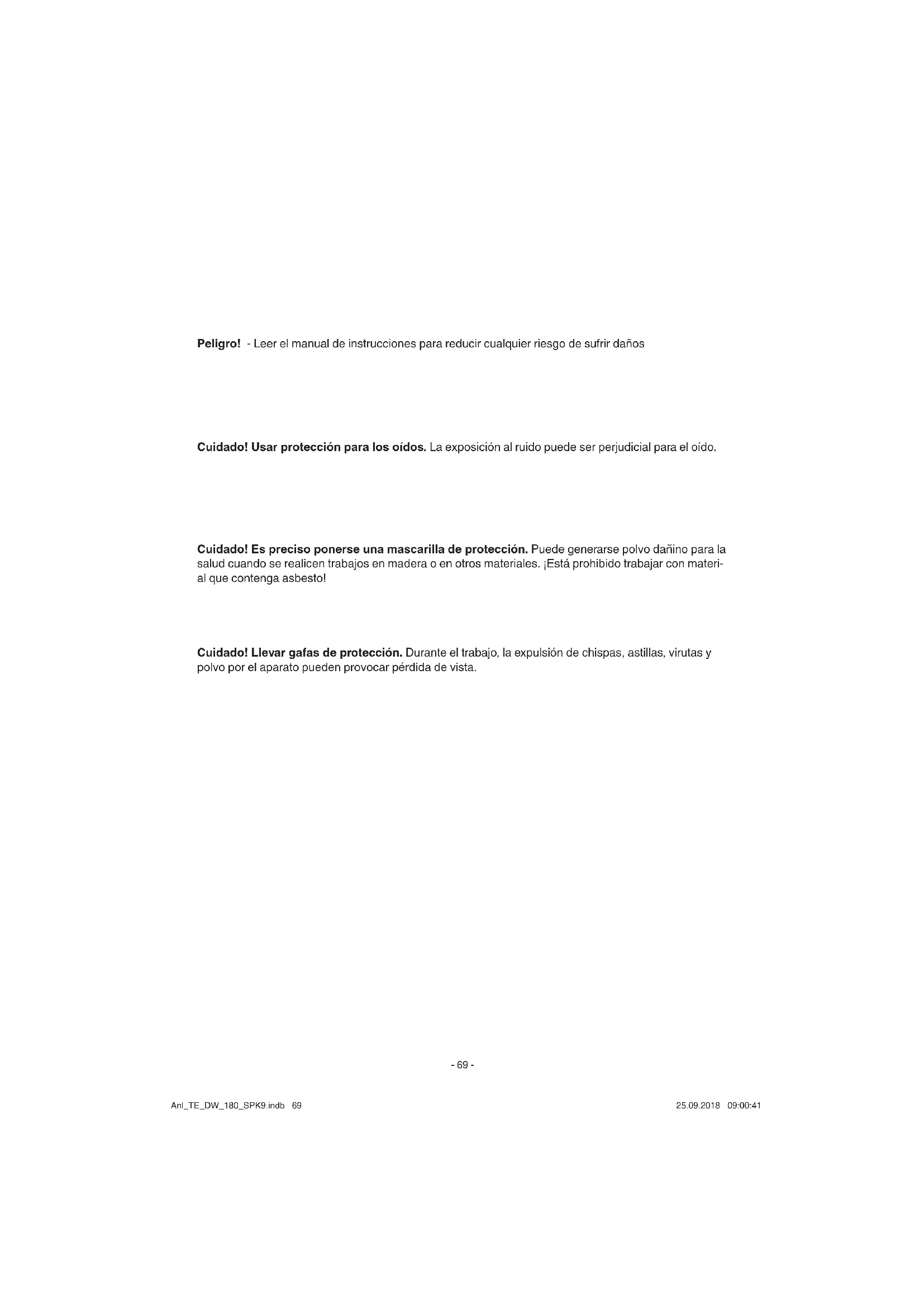 Peligro! - Leer el manual de instrucciones para reducir cualquier riesgo de sufrir daños Cuidado! Usar protección para los oídos. La exposición al ruido puede ser perjudicial para el oído. Cuidado! Llevar gafas de protección. Durante el trabajo, la expulsión de chispas, astillas, virutas y polvo por el aparato pueden provocar pérdida de vista. Cuidado! Es preciso ponerse una mascarilla de protección. Puede generarse polvo dañino para la salud cuando se realicen trabajos en madera o en otros materiales. ¡Está prohibido trabajar con materi- al que contenga asbesto! Anl_TE_DW_180_SPK9.indb 69Anl_TE_DW_180_SPK9.indb 69 25.09.2018 09:00:4125.09.2018 09:00:41E