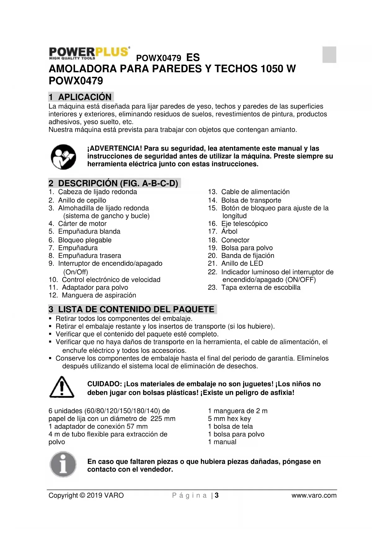 VARO N.V. – Joseph Van Instraat 9. BE2500 Lier – Bélgica, declara que: Tipo de aparato: Amoladora para paredes y techos 1050 W Marca: POWERplus Número del producto: POWX0479 está en conformidad con los requisitos esenciales y otras disposiciones pertinentes de las Directivas europeas aplicables, basados en la aplicación de las normas europeas armonizadas. Cualquier modificación no autorizada de este aparato anula esta declaración. Directivas europeas (incluyendo, si se aplica, sus respectivas enmiendas hasta la fecha de la firma): 2011/65/EU 2006/42/EC 2014/30/EU Normas europeas armonizadas (incluyendo, si se aplica, sus respectivas hasta la fecha de la firma): EN60745-1 : 2009 EN60745-2-3 : 2011 EN55014-1 : 2006 EN55014-2 : 2015 EN61000-3-2 : 2014 EN61000-3-3 : 2013 Custodio de la documentación técnica: Philippe Vankerkhove, VARO – Vic. Van Rompuy N.V. El suscrito actúa en nombre del director general de la compañía, Philippe Vankerkhove Asuntos reglamentarios - Director de conformidad Lier, 20/09/2018POWX0479 IT Copyright © 2019 VARO Pag.| 1 www.varo.com 1 APPLICAZIONE .............................................................................. 3