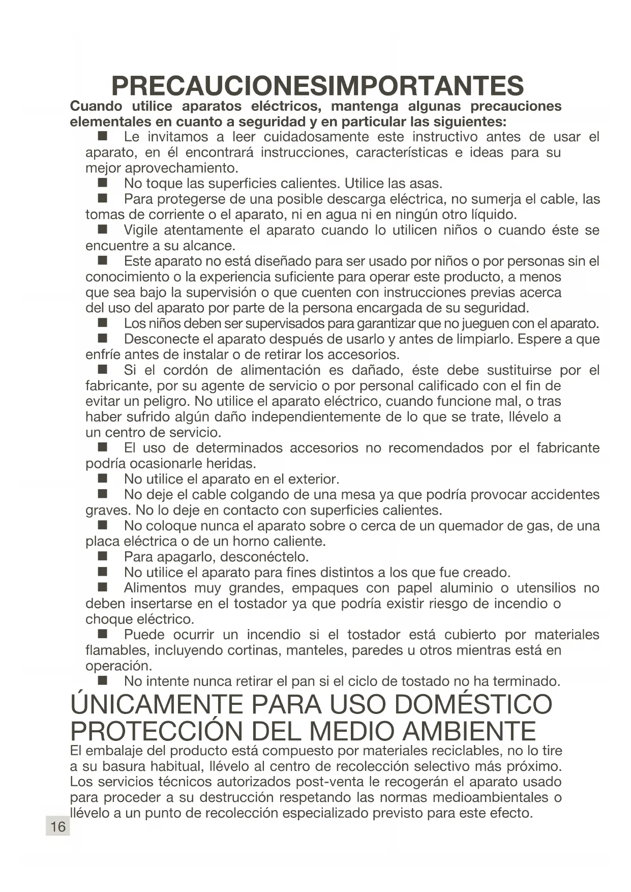 No deje nunca el aparato funcionar sin vigilancia y especialmente en cada primer tostado o cambio de ajuste. No toque las partes metálicas o calientes del aparato mientras lo esté utilizando o antes de que se haya enfriado. No introduzca pan congelado susceptible de derretirse y derramarse por el tostador tampoco pequeños trozos de pan, esto podría causar daños o fuego. No introduzca en el aparato rebanadas de pan demasiado gruesas que puedan bloquear el mecanismo del tostador. El pan puede quemarse, no cubra el aparato durante su funcionamiento y no lo ponga en contacto o cerca de materiales inamables como cortinas, papel pintado o madera (estanterías, muebles …). El aparato debe utilizarse bajo supervisión. No coloque nunca papel, cartón o plástico dentro, sobre o debajo del aparato. Si algunas partes del producto se incendian, no intente nunca apagarlas con agua. Desconecte el aparato y apague las llamas con un paño húmedo. No utilice el tostador como una fuente de calor o de secado. No utilice el tostador para cocer, tostar, calentar o descongelar platos congelados. No desconecte el aparato tirando del cable. Sujete el enchufe y retírelo de la pared. No enrolle el cable alrededor del tostador. Utilice el guarda-cable previsto para este n debajo del aparato. No introduzca el aparato en el agua. No haga funcionar el tostador cerca o debajo de materiales amables como cortinas y gabinetes. No coloque el aparato en la lavavajillas. No coloque nunca pan o croissants directamente sobre el tostador. No introduzca utensilios metálicos en el tostador. No use limpiadores abrasivos utensilios metálicos o bras. Este aparato ha sido diseñado únicamente para uso doméstico. Cualquier utilización profesional, no apropiada o no conforme al modo de empleo no compromete la responsabilidad, ni la garantía del fabricante.18 DESCRIPCIÓN a Revestimiento de paredes frías b Bandeja recoge migajas c Almacenamiento del cable d Botón de puesta en marcha e Botón de ajuste f Función DESCONGELAR g Función CALENTAR h Botón CANCEL (STOP) i Botón BAGEL PRECAUCIÓN: Las precauciones de seguridad forman parte del aparato. Léalas detenidamente antes de usar su nuevo aparato por primera vez. Guárdelas en un lugar de facil acceso para futuras consultas.