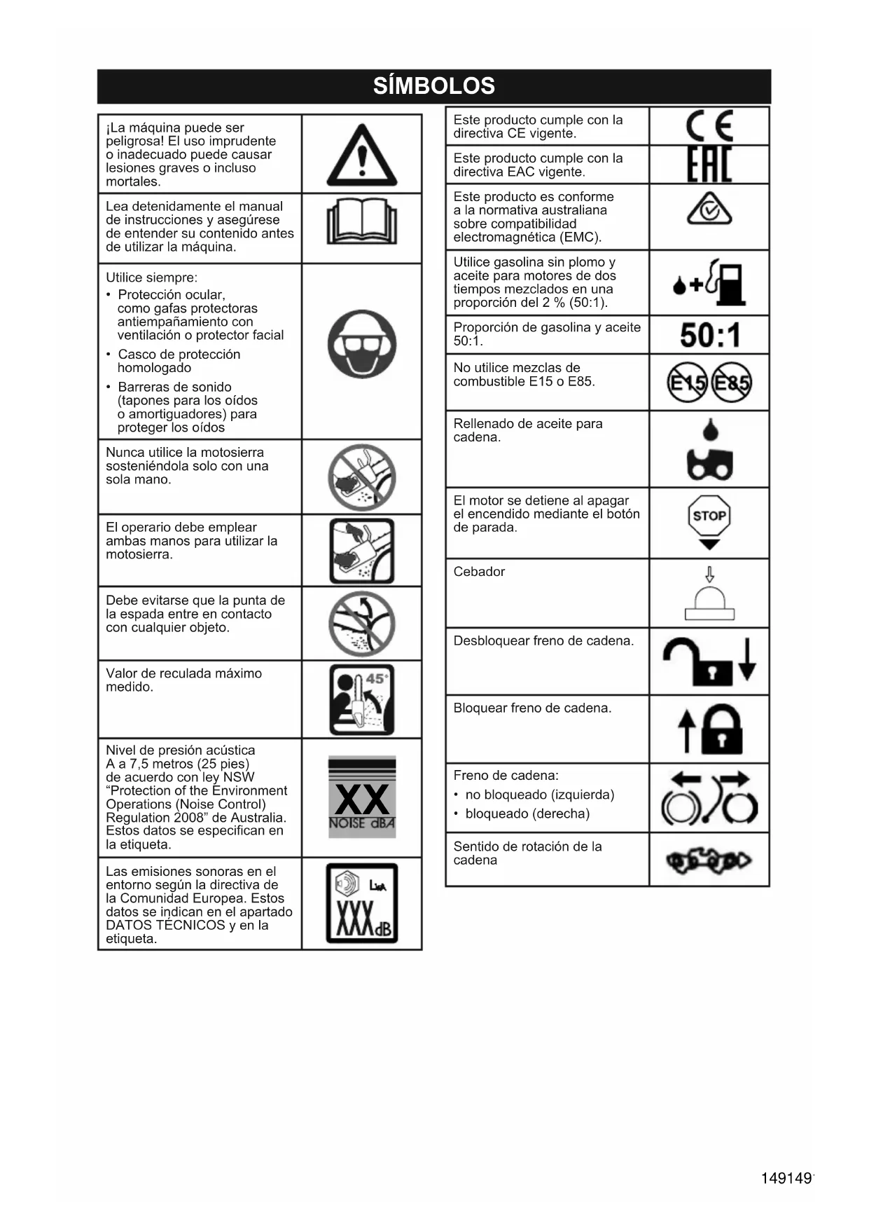 Las emisiones sonoras en el entorno según la directiva de la Comunidad Europea. Estos datos se indican en el apartado DATOS TÉCNICOS y en la etiqueta. Este producto cumple con la directiva CE vigente. Este producto cumple con la directiva EAC vigente. Este producto es conforme a la normativa australiana sobre compatibilidad electromagnética (EMC). Utilice gasolina sin plomo y aceite para motores de dos tiempos mezclados en una proporción del 2 % (50:1). Proporción de gasolina y aceite 50:1. No utilice mezclas de combustible E15 o E85. Rellenado de aceite para cadena. El motor se detiene al apagar el encendido mediante el botón de parada. Cebador Desbloquear freno de cadena. Bloquear freno de cadena. Freno de cadena: