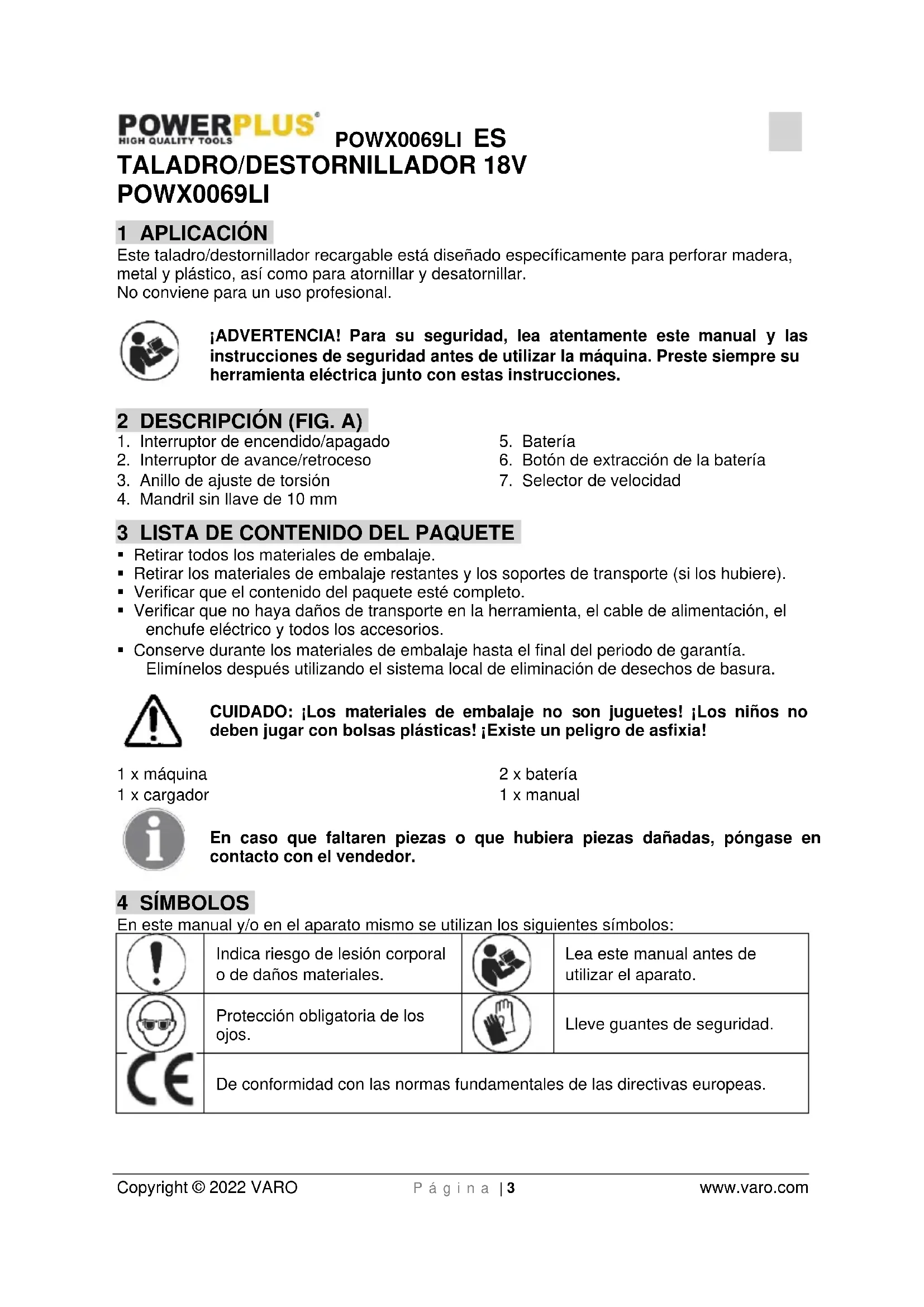 Posiciones de par de apriete 17+1 Capacidad máxima de perforación 10 mm Capacidad máxima de perforación en acero 22 mm Capacidad máxima de perforación en madera 3/5 horas Capacidad de la batería 1500 mAh Tipo de batería Li-ion Par máximo 25 Nm Tipo de mandril Mandril sin llavePOWX0069LI ES Copyright © 2022 VARO P á g i n a | 9 www.varo.com 11 RUIDO Valores de emisión de ruidos medidos de conformidad con la norma pertinente. (K=3) Nivel de presión acústica LpA 84 dB(A) Nivel de potencia acústica LwA 95 dB(A) ¡ATENCIÓN! Utilice una protección auricular cuando la presión acústica sea superior a 85 dB(A). aW (Nivel de vibración): Máx. 9,1 m/s² K = 1,5 m/s²