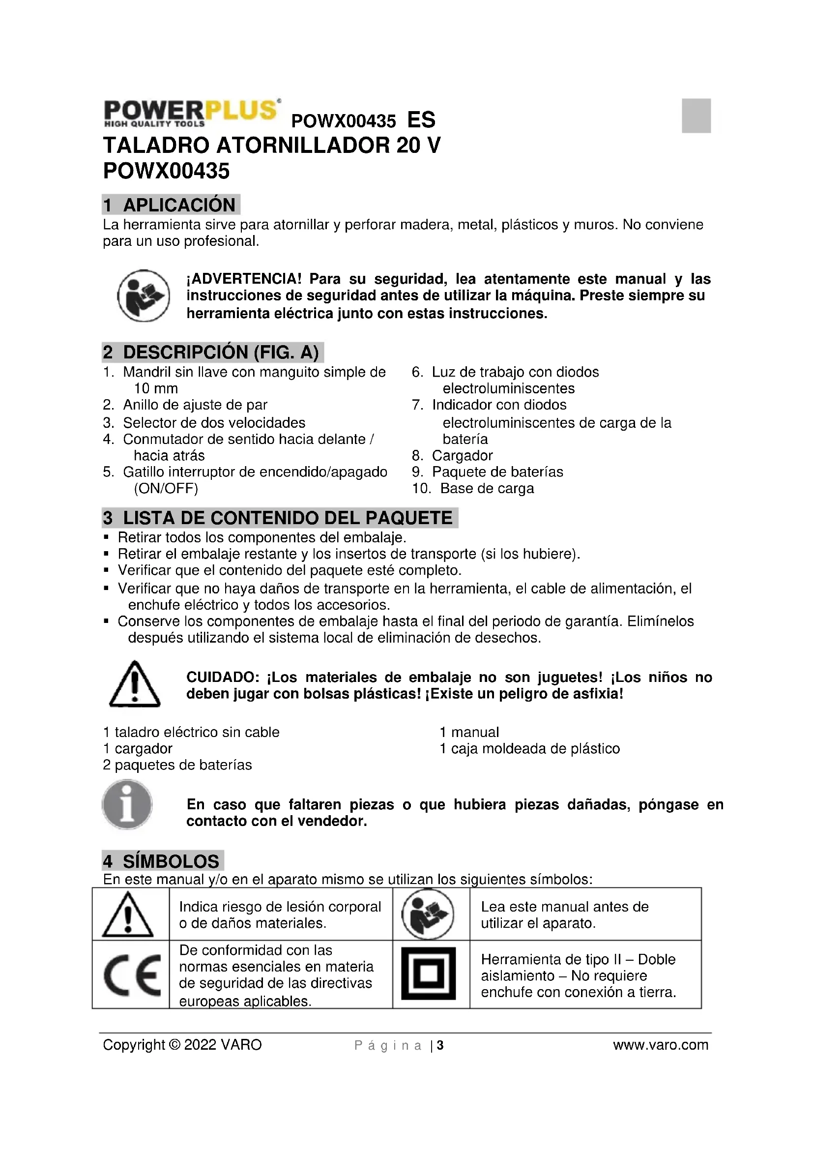 VARO N.V. – Vic. Van Rompuy N.V-… Joseph Van Instraat 9. BE2500 Lier – Bélgica, declara que: Tipo de aparato: Taladro Atornillador Marca: POWERplus Número del producto: POWX00435 está en conformidad con los requisitos esenciales y otras disposiciones pertinentes de las Directivas europeas aplicables, basados en la aplicación de las normas europeas armonizadas. Cualquier modificación no autorizada de este aparato anula esta declaración. Directivas europeas (incluyendo, si se aplica, sus respectivas enmiendas hasta la fecha de la firma): 2011/65/EU 2006/42/EC 2014/30/EU Normas europeas armonizadas (incluyendo, si se aplica, sus respectivas hasta la fecha de la firma): EN62841-1 : 2015 EN62841-2-1 : 2018 EN55014-1:2017 EN55014-2 : 2015 Custodio de la documentación técnica: Philippe Vankerkhove, VARO – Vic. Van Rompuy N.V. El suscrito actúa en nombre del director general de la compañía, Ludo Mertens Asuntos reglamentarios - Director de conformidad 07/01/2022, Lier - BelgiumPOWX00435 IT Copyright © 2022 VARO Pag. | 1 www.varo.com 1 APPLICAZIONE .............................................................................. 3