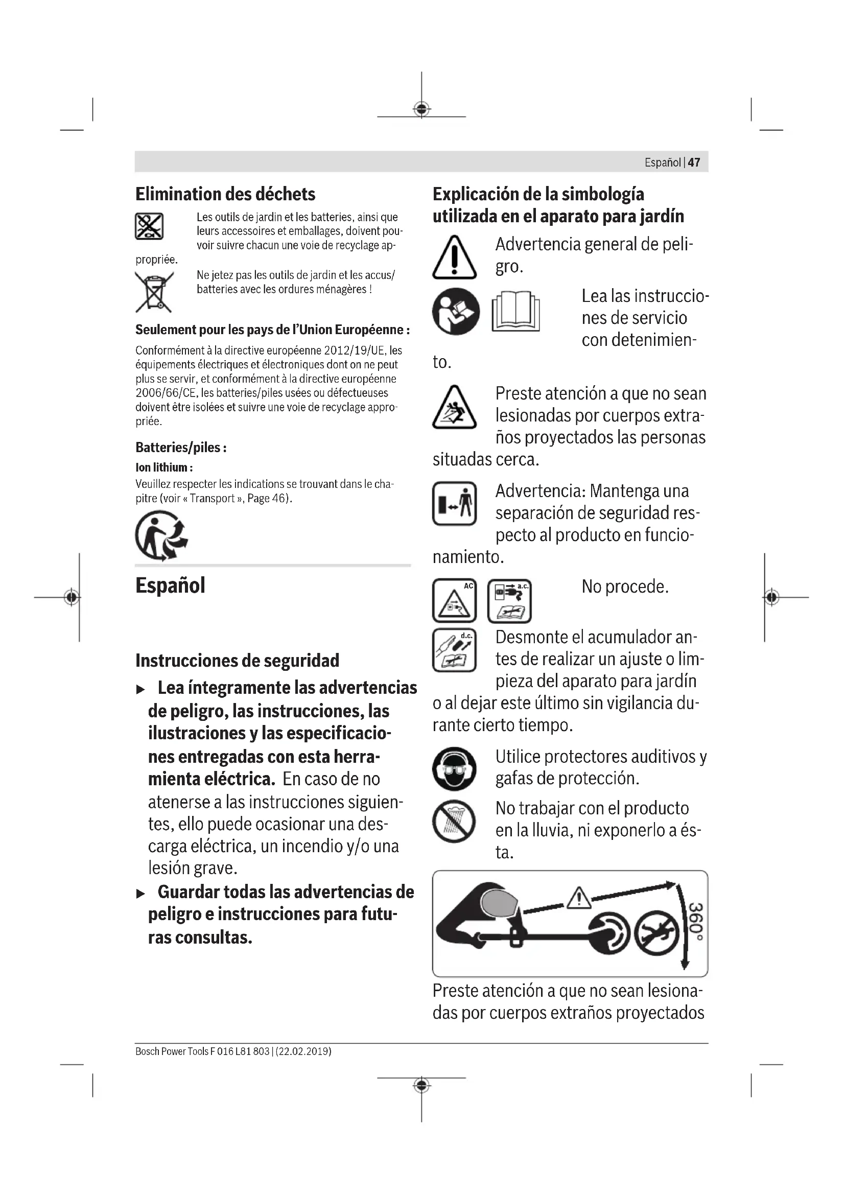 a.c. No procede. d.c. Desmonte el acumulador an- tes de realizar un ajuste o lim- pieza del aparato para jardín o al dejar este último sin vigilancia du- rante cierto tiempo. Utilice protectores auditivos y gafas de protección. No trabajar con el producto en la lluvia, ni exponerlo a és- ta. Preste atención a que no sean lesiona- das por cuerpos extraños proyectados Bosch Power Tools F 016 L81 803 | (22.02.2019)48 | Español las personas situadas cerca. Advertencia: Mantenga una separación de seguridad respecto al aparato para jardín en funcionamiento. Examine detenidamente si existen animales silvestres o domésticos en el área en el que pretende usar el aparato para jar- dín. Los animales silvestres o domésti- cos pueden ser lesionados durante el uso de la máquina. Examine con dete- nimiento el área de trabajo de la má- quina y retire todas las piedras, palos, alambres, huesos y demás objetos ex- traños que encuentre. Al utilizar la má- quina cuide que no se encuentren ocultos por el denso césped animales silvestres y domésticos o pequeños to- cones. Indicaciones generales de seguridad para herramientas eléctricas u Lea íntegramente las advertencias de peligro, las instrucciones, las ilustraciones y las especificacio- nes entregadas con esta herra- mienta eléctrica. En caso de no atenerse a las instrucciones siguien- tes, ello puede ocasionar una des- carga eléctrica, un incendio y/o una lesión grave. u Guardar todas las advertencias de peligro e instrucciones para futu- ras consultas. u El término "herramienta eléctrica" empleado en las siguientes adverten- cias de peligro se refiere a herra- mientas eléctricas de conexión a la red (con cable de red) y a herramien- tas eléctricas accionadas por acumu- lador (sin cable de red). Seguridad del puesto de trabajo u Mantenga el área de trabajo limpia y bien iluminada. Las áreas desor- denadas u oscuras pueden provocar accidentes. u No utilice herramientas eléctricas en un entorno con peligro de ex- plosión, en el que se encuentren combustibles líquidos, gases o ma- terial en polvo. Las herramientas eléctricas producen chispas que pueden llegar a inflamar los materia- les en polvo o vapores. u Mantenga alejados a los niños y otras personas de su puesto de trabajo al emplear la herramienta eléctrica. Una distracción le puede hacer perder el control sobre la he- rramienta eléctrica. Seguridad eléctrica u El enchufe de la herramienta eléc- trica debe corresponder a la toma de corriente utilizada. No es admi- sible modificar el enchufe en for- ma alguna. No emplear adaptado- res en herramientas eléctricas do- tadas con una toma de tierra. Los enchufes sin modificar adecuados a las respectivas tomas de corriente reducen el riesgo de una descarga eléctrica. F 016 L81 803 | (22.02.2019) Bosch Power ToolsEspañol | 49 u Evite que su cuerpo toque partes conectadas a tierra como tuberías, radiadores, cocinas y refrigerado- res. El riesgo a quedar expuesto a una sacudida eléctrica es mayor si su cuerpo tiene contacto con tierra. u No exponga la herramienta eléctri- ca a la lluvia o a condiciones húme- das. Existe el peligro de recibir una descarga eléctrica si penetran cier- tos líquidos en la herramienta eléctri- ca. u No abuse del cable de red. No utili- ce el cable de red para transportar o colgar la herramienta eléctrica, ni tire de él para sacar el enchufe de la toma de corriente. Mantenga el cable de red alejado del calor, aceite, esquinas cortantes o pie- zas móviles. Los cables de red da- ñados o enredados pueden provocar una descarga eléctrica. u Al trabajar con la herramienta eléctrica a la intemperie utilice so- lamente cables de prolongación apropiados para su uso al aire li- bre. La utilización de un cable de prolongación adecuado para su uso en exteriores reduce el riesgo de una descarga eléctrica. u Si fuese imprescindible utilizar la herramienta eléctrica en un entor- no húmedo, es necesario conectar- la a través de un dispositivo de co- rriente residual (RCD) de seguri- dad (fusible diferencial). La aplica- ción de un fusible diferencial reduce el riesgo a exponerse a una descarga eléctrica. Seguridad de personas u Esté atento a lo que hace y emplee sentido común cuando utilice una herramienta eléctrica. No utilice la herramienta eléctrica si estuvie- se cansado, ni tampoco después de haber consumido drogas, alco- hol o medicamentos. El no estar atento durante el uso de la herra- mienta eléctrica puede provocarle serias lesiones. u Utilice un equipo de protección personal. Utilice siempre una pro- tección para los ojos. El riesgo a le- sionarse se reduce considerable- mente si se utiliza un equipo de pro- tección adecuado como una masca- rilla antipolvo, zapatos de seguridad con suela antideslizante, casco, o protectores auditivos. u Evite una puesta en marcha invo- luntaria. Asegurarse de que la he- rramienta eléctrica esté desconec- tada antes de conectarla a la toma de corriente y/o al montar el acu- mulador, al recogerla y al trans- portarla. Si transporta la herra- mienta eléctrica sujetándola por el interruptor de conexión/descone- xión, o si alimenta la herramienta eléctrica estando ésta conectada, ello puede dar lugar a un accidente. u Retire las herramientas de ajuste o llaves fijas antes de conectar la he- Bosch Power Tools F 016 L81 803 | (22.02.2019)50 | Español rramienta eléctrica. Una herra- mienta de ajuste o llave fija colocada en una pieza rotante puede producir lesiones al poner a funcionar la he- rramienta eléctrica. u Evite posturas arriesgadas. Traba- je sobre una base firme y manten- ga el equilibrio en todo momento. Ello le permitirá controlar mejor la herramienta eléctrica en caso de presentarse una situación inespera- da. u Lleve puesta una vestimenta de trabajo adecuada. No utilice vesti- menta amplia ni joyas. Mantenga su pelo y vestimenta alejados de las piezas móviles. La vestimenta suelta, el pelo largo y las joyas se