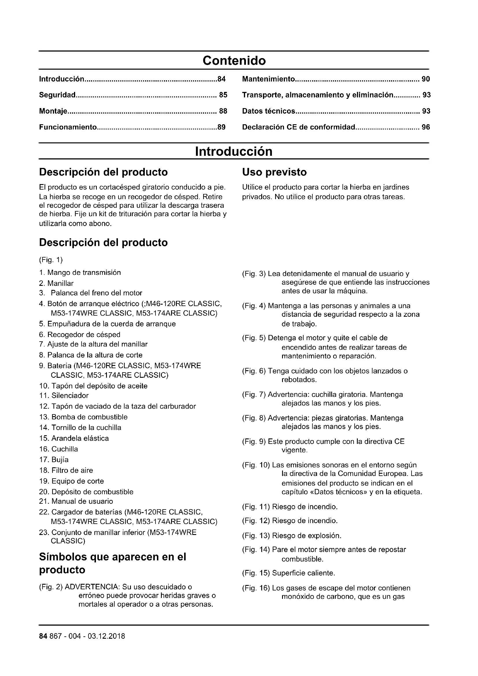 CLASSIC) Símbolos que aparecen en el producto (Fig. 2) ADVERTENCIA: Su uso descuidado o erróneo puede provocar heridas graves o mortales al operador o a otras personas. (Fig. 3) Lea detenidamente el manual de usuario y asegúrese de que entiende las instrucciones antes de usar la máquina. (Fig. 4) Mantenga a las personas y animales a una distancia de seguridad respecto a la zona de trabajo. (Fig. 5) Detenga el motor y quite el cable de encendido antes de realizar tareas de mantenimiento o reparación. (Fig. 6) Tenga cuidado con los objetos lanzados o rebotados. (Fig. 7) Advertencia: cuchilla giratoria. Mantenga alejados las manos y los pies. (Fig. 8) Advertencia: piezas giratorias. Mantenga alejados las manos y los pies. (Fig. 9) Este producto cumple con la directiva CE vigente. (Fig. 10) Las emisiones sonoras en el entorno según la directiva de la Comunidad Europea. Las emisiones del producto se indican en el capítulo «Datos técnicos» y en la etiqueta. (Fig. 11) Riesgo de incendio. (Fig. 12) Riesgo de incendio. (Fig. 13) Riesgo de explosión. (Fig. 14) Pare el motor siempre antes de repostar combustible. (Fig. 15) Superficie caliente. (Fig. 16) Los gases de escape del motor contienen monóxido de carbono, que es un gas 84 867 - 004 - 03.12.2018inodoro, tóxico y muy peligroso. No use el producto en interiores ni en espacios cerrados. (Fig. 17) Los gases de escape del motor contienen monóxido de carbono, que es un gas inodoro, tóxico y muy peligroso. No use el producto en interiores ni en espacios cerrados. Nota: Los demás símbolos/etiquetas que aparecen en el producto corresponden a requisitos de homologación específicos en otras zonas comerciales. UE V ADVERTENCIA: La manipulación del motor anula la homologación de la UE de este producto. Responsabilidad sobre el producto Como se estipula en las leyes de responsabilidad del producto, no nos hacemos responsables de los daños y perjuicios causados por nuestro producto si: