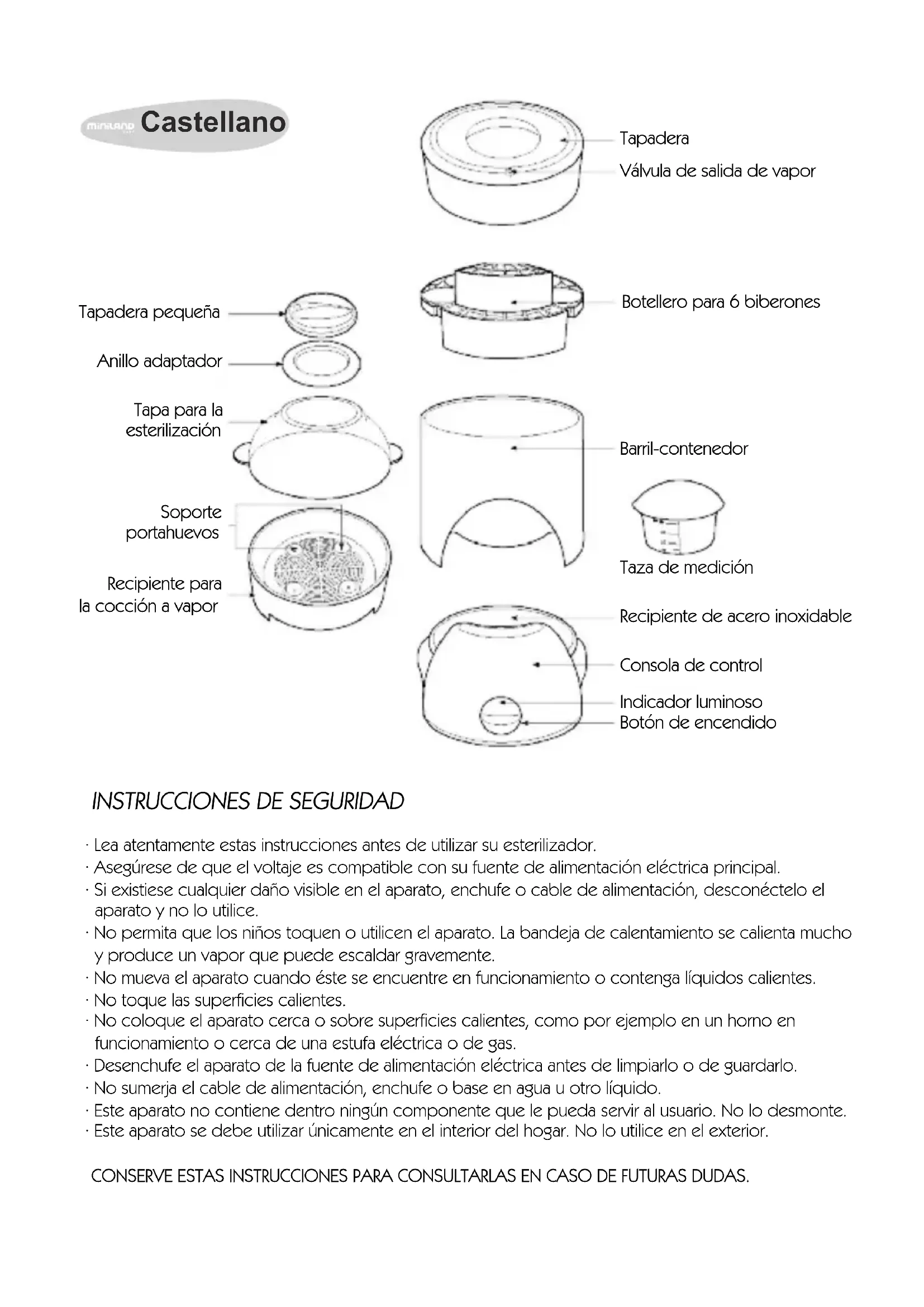 - Este aparato se debe utilizar únicamente en el interior del hogar. No lo utilice en el exterior. CONSERVE ESTAS INSTRUCCIONES PARA CONSULTARLAS EN CASO DE FUTURAS DUDAS. Tapadera Válvula de salida de vapor Tapadera pequeña Botellero para 6 biberones Anillo adaptador Tapa para la esterilización Barril-contenedor Soporte portahuevos Recipiente para la cocción a vapor Taza de medición Recipiente de acero inoxidable Consola de control Indicador luminoso Botón de encendido CastellanoINSTRUCCIONES DE USO Es importante que todas las botellas, tetinas y accesorios estén vacíos, limpios y completamente aclarados con agua antes de colocarlos en el aparato y comenzar el proceso de esterilización.