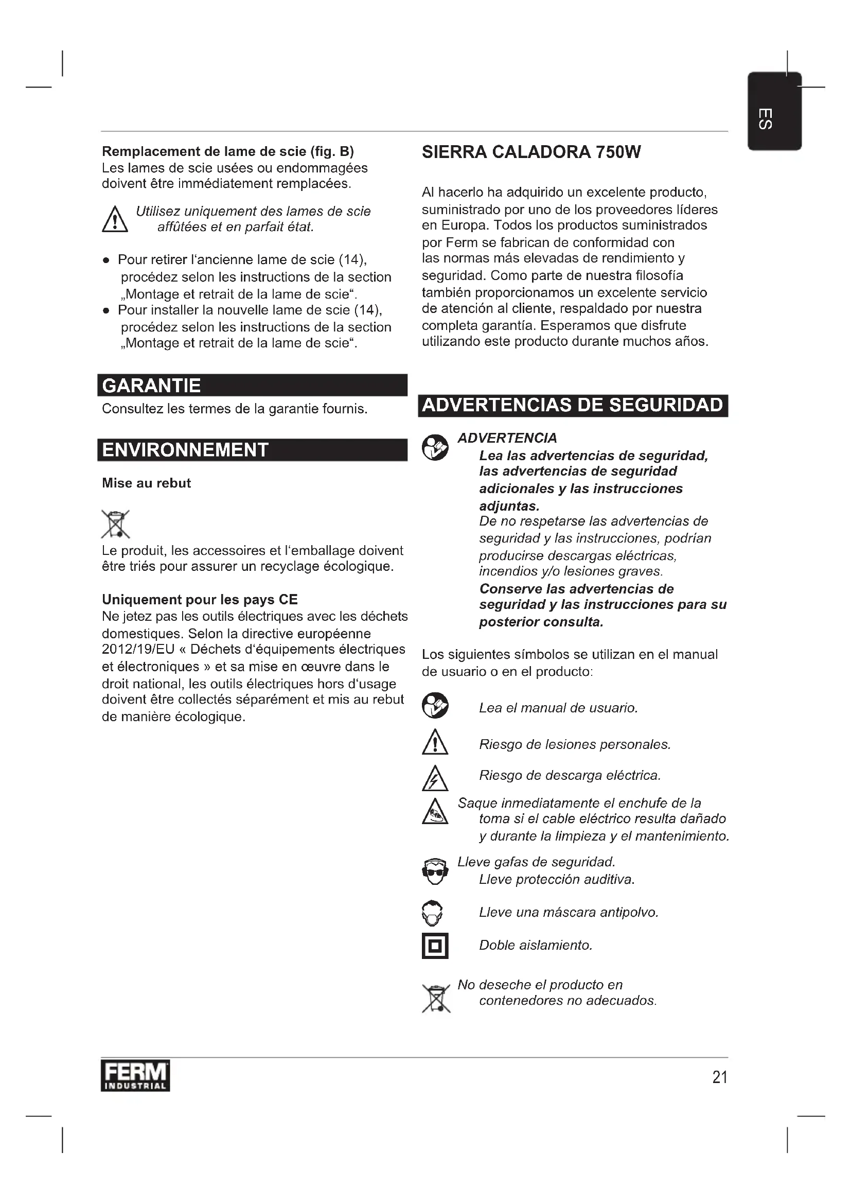 Utilice sólo hojas de sierra aladas y sin daños. ● Para retirar la hoja de sierra antigua (14), proceda como se describe en la sección „Montaje y retirada de la hoja de sierra“. ● Para montar la hoja de sierra nueva (14), proceda como se describe en la sección „Montaje y retirada de la hoja de sierra“. GARANTÍA Consulte las condiciones de la garantía adjunta. MEDIO AMBIENTE Desechado El producto, los accesorios y el embalaje deben clasicarse para un reciclaje respetuoso con el medio ambiente. Sólo para países CE No deseche las herramientas eléctricas con los residuos domésticos. De conformidad con la Directiva Europea 2012/19/EU sobre residuos de aparatos eléctricos y electrónicos y su implementación en el derecho nacional, las herramientas eléctricas que dejen de funcionar deben recogerse por separado y desecharse de forma respetuosa con el medio ambiente.