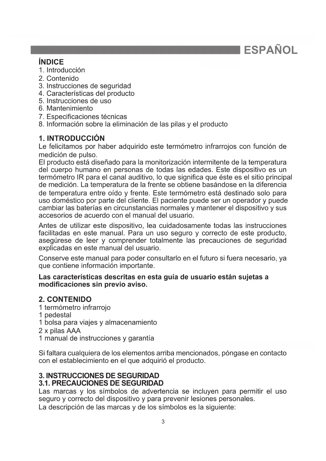 Le felicitamos por haber adquirido este termómetro infrarrojos con función de medición de pulso. El producto está diseñado para la monitorización intermitente de la temperatura del cuerpo humano en personas de todas las edades. Este dispositivo es un termómetro IR para el canal auditivo, lo que signica que éste es el sitio principal de medición. La temperatura de la frente se obtiene basándose en la diferencia de temperatura entre oído y frente. Este termómetro está destinado solo para uso doméstico por parte del cliente. El paciente puede ser un operador y puede cambiar las baterías en circunstancias normales y mantener el dispositivo y sus accesorios de acuerdo con el manual del usuario. Antes de utilizar este dispositivo, lea cuidadosamente todas las instrucciones facilitadas en este manual. Para un uso seguro y correcto de este producto, asegúrese de leer y comprender totalmente las precauciones de seguridad explicadas en este manual del usuario. Conserve este manual para poder consultarlo en el futuro si fuera necesario, ya que contiene información importante. Las características descritas en esta guía de usuario están sujetas a modicaciones sin previo aviso.