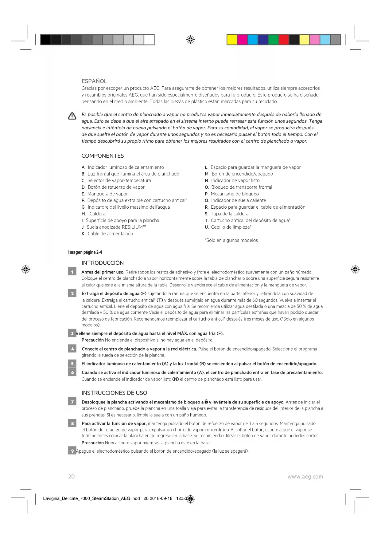 Lavignia_Delicate_7000_SteamStation_AEG.indd 19 2018-09-18 12:53:3620 www.aeg.com ESPAÑOL Gracias por escoger un producto AEG. Para asegurarte de obtener los mejores resultados, utiliza siempre accesorios y recambios originales AEG, que han sido especialmente diseñados para tu producto. Este producto se ha diseñado pensando en el medio ambiente. Todas las piezas de plástico están marcadas para su reciclado. Es posible que el centro de planchado a vapor no produzca vapor inmediatamente después de haberlo llenado de agua. Esto se debe a que el aire atrapado en el sistema interno puede retrasar esta función unos segundos. Tenga paciencia e inténtelo de nuevo pulsando el botón de vapor. Para su comodidad, el vapor se producirá después de que suelte el botón de vapor durante unos segundos y no es necesario pulsar el botón todo el tiempo. Con el tiempo descubrirá su propio ritmo para obtener los mejores resultados con el centro de planchado a vapor. COMPONENTES A. Indicador luminoso de calentamiento B. Luz frontal que ilumina el área de planchado C. Selector de vapor-temperatura D. Botón de refuerzo de vapor E. Manguera de vapor F. Depósito de agua extraible con cartucho antical* G. Indicatore del livello massimo dell’acqua H. Caldera