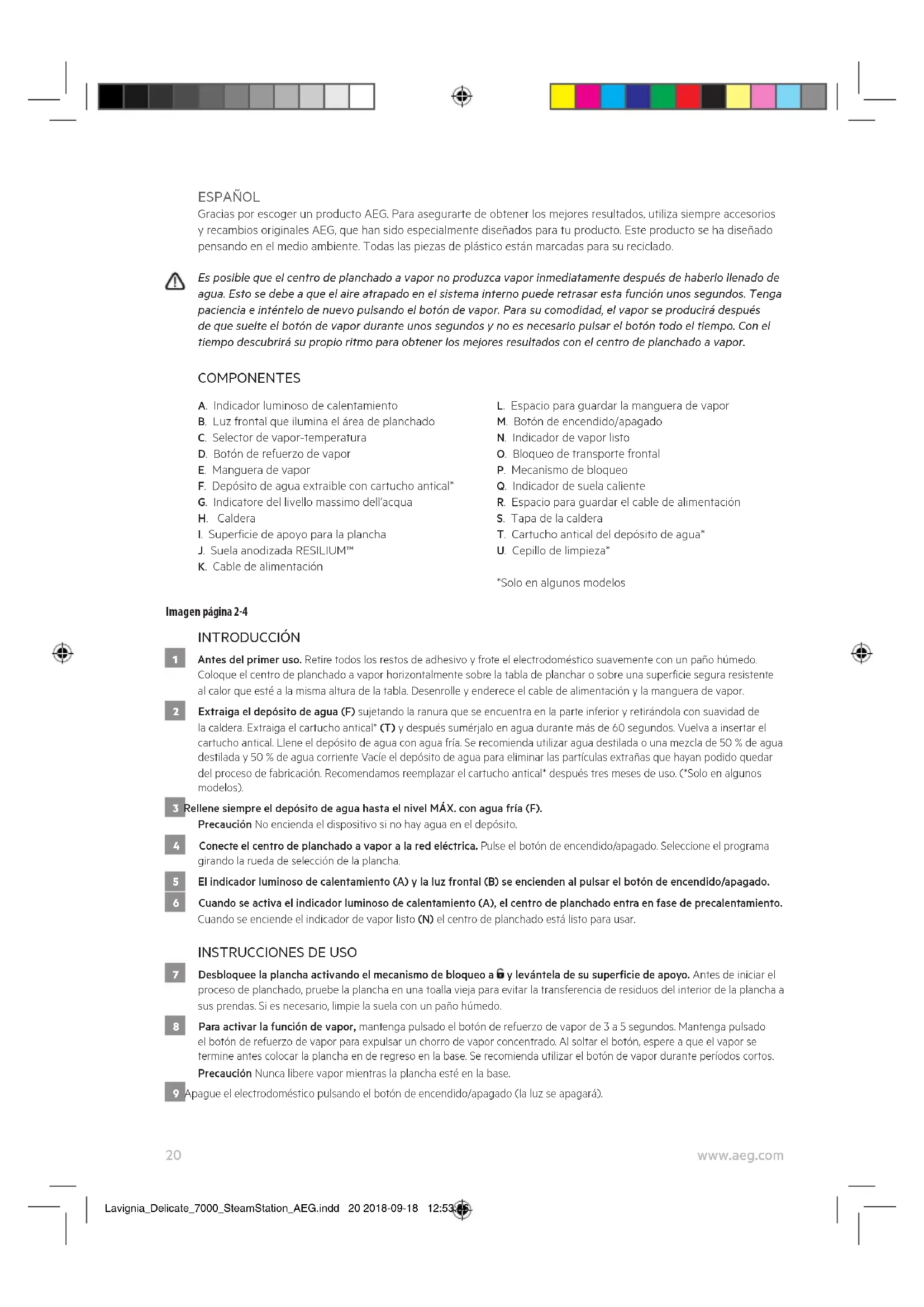 Lavignia_Delicate_7000_SteamStation_AEG.indd 19 2018-09-18 12:53:3620 www.aeg.com ESPAÑOL Gracias por escoger un producto AEG. Para asegurarte de obtener los mejores resultados, utiliza siempre accesorios y recambios originales AEG, que han sido especialmente diseñados para tu producto. Este producto se ha diseñado pensando en el medio ambiente. Todas las piezas de plástico están marcadas para su reciclado. Es posible que el centro de planchado a vapor no produzca vapor inmediatamente después de haberlo llenado de agua. Esto se debe a que el aire atrapado en el sistema interno puede retrasar esta función unos segundos. Tenga paciencia e inténtelo de nuevo pulsando el botón de vapor. Para su comodidad, el vapor se producirá después de que suelte el botón de vapor durante unos segundos y no es necesario pulsar el botón todo el tiempo. Con el tiempo descubrirá su propio ritmo para obtener los mejores resultados con el centro de planchado a vapor. COMPONENTES A. Indicador luminoso de calentamiento B. Luz frontal que ilumina el área de planchado C. Selector de vapor-temperatura D. Botón de refuerzo de vapor E. Manguera de vapor F. Depósito de agua extraible con cartucho antical* G. Indicatore del livello massimo dell’acqua H. Caldera