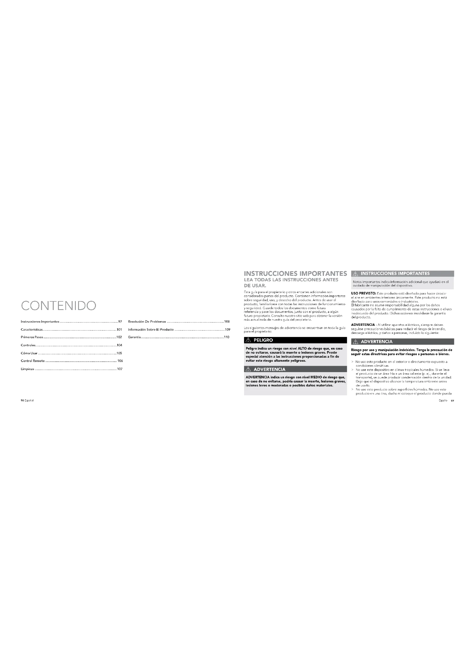 DE USAR. (estado sólido). Para reducir el riesgo de incendio o descarga eléctrica y lesiones a personas, no use en una ventana. ADVERTENCIA Riesgo para niños y otras personas de grupos de riesgo. Este electrodoméstico puede ser utilizado por niños mayores de 8 años y personas con capacidades físicas, sensoriales o mentales reducidas o falta de experiencia y conocimientos si han recibido supervisión o instrucciones sobre el uso seguro del electrodoméstico y comprenden los peligros que ello implica. Los niños no deben jugar con el electrodoméstico. Las tareas de limpieza y mantenimiento por parte del usuario no pueden ser realizadas por niños sin supervisión. Este producto y su material de empaquetado no son juguetes y deben mantenerse lejos del alcance de los niños. Información sobre la Declaración de Conformidad CE Este producto cumple con todas las directivas CE relevantes y necesarias, incluidas las siguientes: - Directiva de baja tensión - Directiva de compatibilidad electromagnética - Directiva de productos relacionados con la energía - Directiva de restricción de sustancias peligrosas - Registro, evaluación, autorización, y restricción de químicos La Declaración de Conformidad completa está registrada y puede obtenerse mediante el importador. RECICLAJE DEL PAQUETE: El empaquetado protege el electrodoméstico contra daños durante el transporte. Los materiales de empaquetado son seleccionados desde el punto de vista de su compatibilidad con el medio ambiente y tecnología de desecho y, por lo tanto, son reciclables. Deseche los materiales de empaquetado de forma responsable con el medio ambiente. Reciclaje De Residuos De Aparatos Eléctricos y Electrónicos Residuos eléctricos y desecho de equipos electrónicos: Esta marca indica que el producto no se debe desechar junto con otros residuos domésticos en ninguna parte de la UE. Para evitar los posibles daños que el desecho no controlado de residuos puede causar al medio ambiente o la salud humana, recíclelo de forma responsable para fomentar la reutilización sustentable de los recursos materiales. Para entregar el aparato usado, utilice los sistemas de entrega y recolección o comuníquese con la tienda en la que compró el producto. Ellos reciclarán el producto de forma segura para el medio ambiente.101 Español 100 Español INSTRUCCIONES IMPORTANTES
