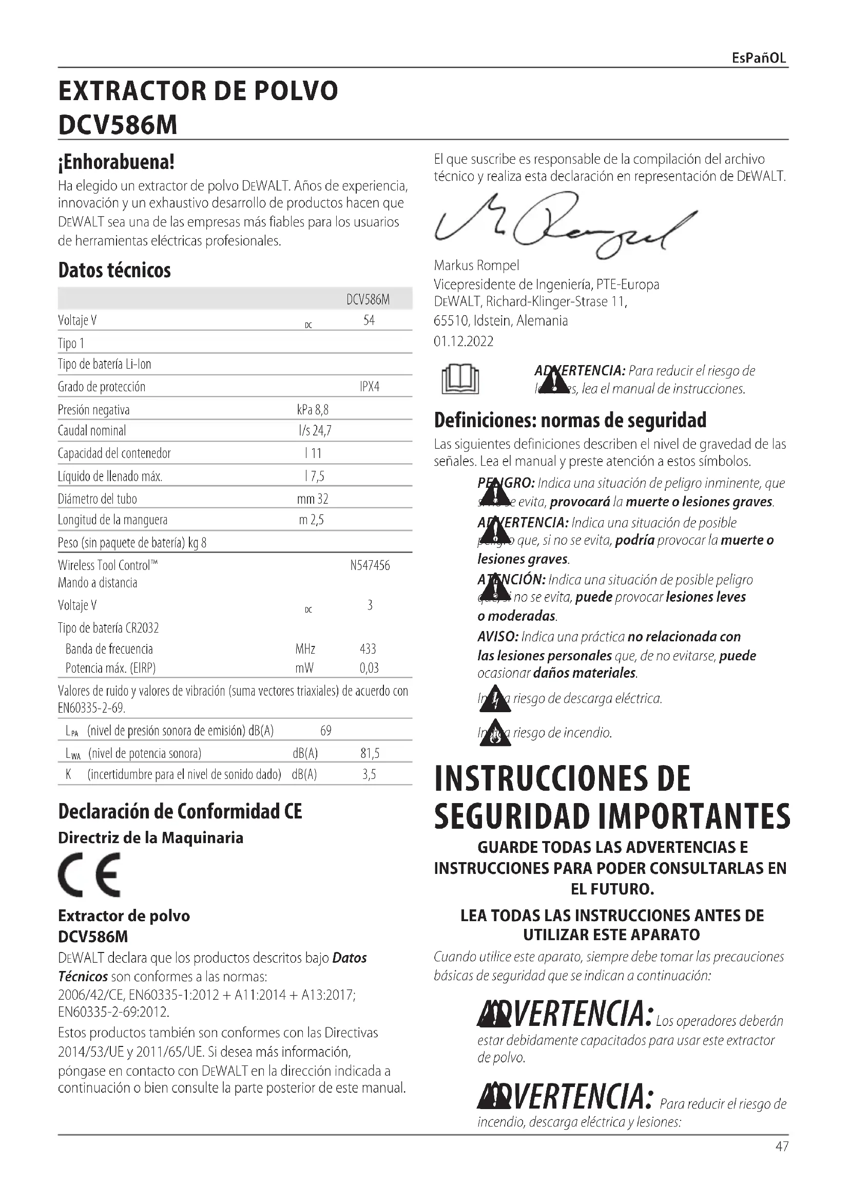 Tool does not pair Dust extractor is not in Wireless Tool Control ( ) mode. Move three position switch to Wireless Tool Control™ ( ) mode. Confirm LED is illuminated. If LED is not illuminated with the three‑position switch in Wireless Tool Control™ ( ) mode, contact DeWALT service centre. Tool is not Wireless Tool Control™ enabled. Confirm that tool is Wireless Tool Control™ enabled.47 EsPañOLEl que suscribe es responsable de la compilación del archivo técnico y realiza esta declaración en representación deDeWALT.Markus Rompel Vicepresidente de Ingeniería, PTE‑Europa DeWALT, Richard‑Klinger‑Strase 11, 65510, Idstein, Alemania01.12.2022 ADVERTENCIA: Para reducir el riesgo de lesiones, lea el manual deinstrucciones. Definiciones: normas de seguridad Las siguientes definiciones describen el nivel de gravedad de las señales. Lea el manual y preste atención a estossímbolos. PELIGRO: Indica una situación de peligro inminente, que si no se evita, provocará la muerte o lesionesgraves.