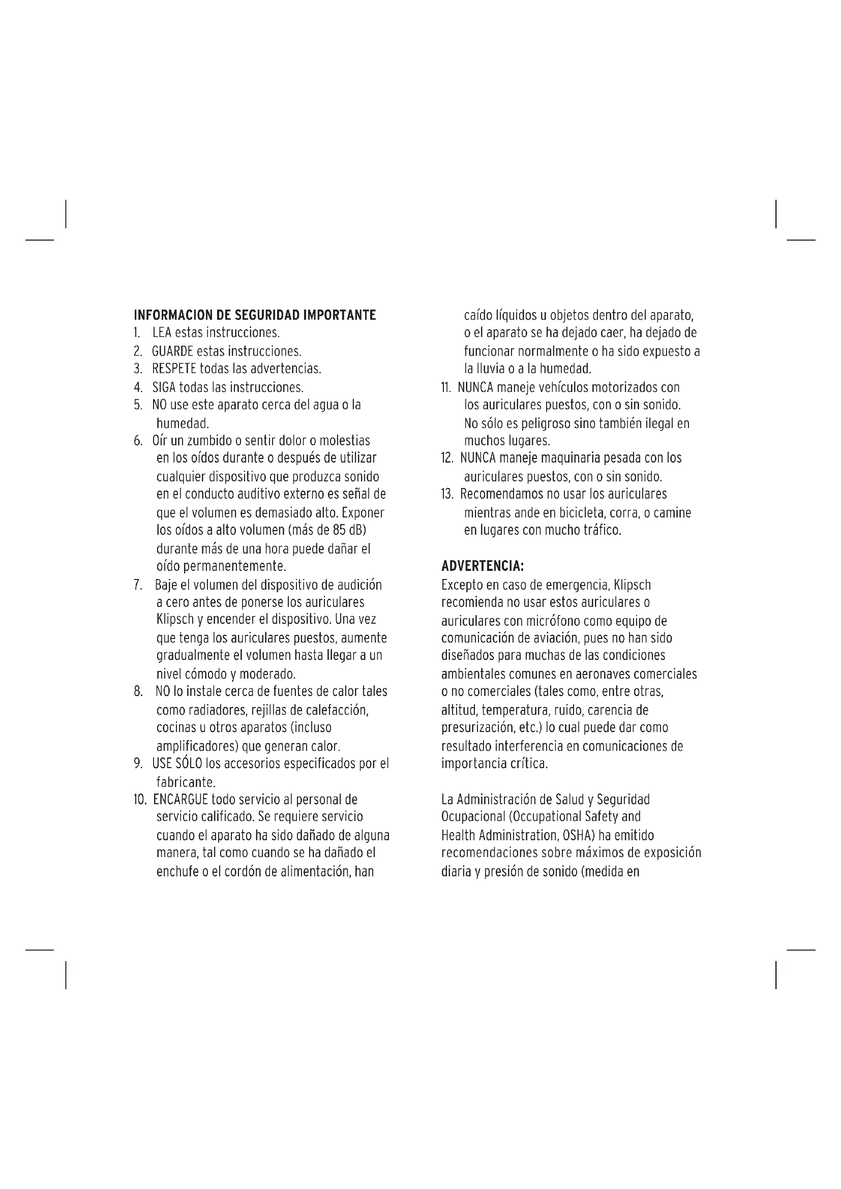 mientras ande en bicicleta, corra, o camine en lugares con mucho tráfico. ADVERTENCIA: Excepto en caso de emergencia, Klipsch recomienda no usar estos auriculares o auriculares con micrófono como equipo de comunicación de aviación, pues no han sido diseñados para muchas de las condiciones ambientales comunes en aeronaves comerciales o no comerciales (tales como, entre otras, altitud, temperatura, ruido, carencia de presurización, etc.) lo cual puede dar como resultado interferencia en comunicaciones de importancia crítica. La Administración de Salud y Seguridad Ocupacional (Occupational Safety and Health Administration, OSHA) ha emitido recomendaciones sobre máximos de exposición diaria y presión de sonido (medida endecibeles {dB}). El decibel es una unidad de medida de sonido. Los decibeles aumentan exponencialmente a medida que aumenta el volumen. Por ejemplo, la conversación normal se produce por lo general a aproximadamente 60 dB; un concierto de rock en un estadio genera a menudo 110 dB. PAUTAS DE LA OSHA SOBRE LÍMITES DE