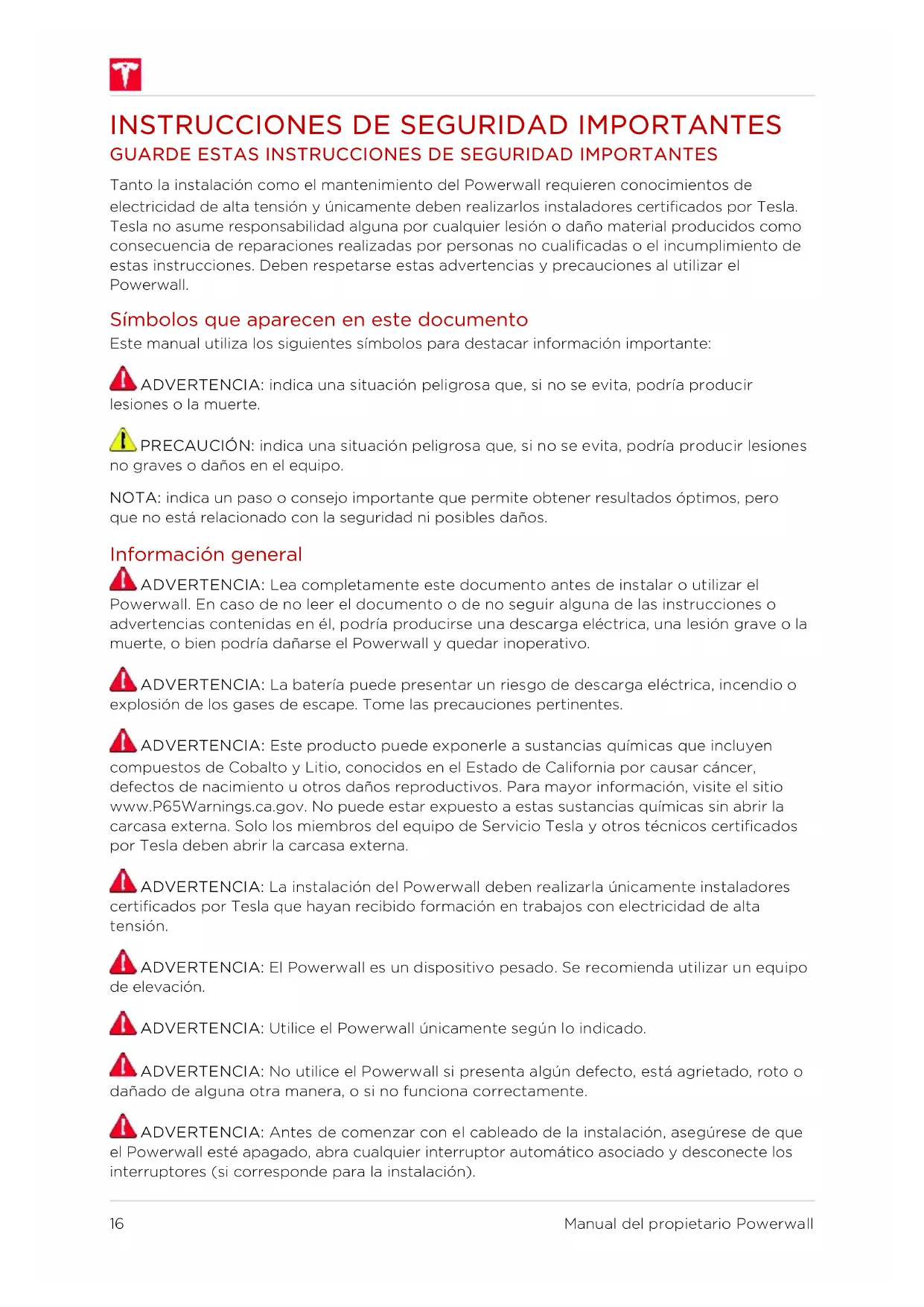 Tanto la instalación como el mantenimiento del Powerwall requieren conocimientos de electricidad de alta tensión y únicamente deben realizarlos instaladores certificados por Tesla. Tesla no asume responsabilidad alguna por cualquier lesión o daño material producidos como consecuencia de reparaciones realizadas por personas no cualificadas o el incumplimiento de estas instrucciones. Deben respetarse estas advertencias y precauciones al utilizar el Powerwall. Símbolos que aparecen en este documento Este manual utiliza los siguientes símbolos para destacar información importante: ADVERTENCIA: indica una situación peligrosa que, si no se evita, podría producir lesiones o la muerte. PRECAUCIÓN: indica una situación peligrosa que, si no se evita, podría producir lesiones no graves o daños en el equipo. NOTA: indica un paso o consejo importante que permite obtener resultados óptimos, pero que no está relacionado con la seguridad ni posibles daños. Información general ADVERTENCIA: Lea completamente este documento antes de instalar o utilizar el Powerwall. En caso de no leer el documento o de no seguir alguna de las instrucciones o advertencias contenidas en él, podría producirse una descarga eléctrica, una lesión grave o la muerte, o bien podría dañarse el Powerwall y quedar inoperativo. ADVERTENCIA: La batería puede presentar un riesgo de descarga eléctrica, incendio o explosión de los gases de escape. Tome las precauciones pertinentes. ADVERTENCIA: Este producto puede exponerle a sustancias químicas que incluyen compuestos de Cobalto y Litio, conocidos en el Estado de California por causar cáncer, defectos de nacimiento u otros daños reproductivos. Para mayor información, visite el sitio www.P65Warnings.ca.gov. No puede estar expuesto a estas sustancias químicas sin abrir la carcasa externa. Solo los miembros del equipo de Servicio Tesla y otros técnicos certificados por Tesla deben abrir la carcasa externa. ADVERTENCIA: La instalación del Powerwall deben realizarla únicamente instaladores certificados por Tesla que hayan recibido formación en trabajos con electricidad de alta tensión. ADVERTENCIA: El Powerwall es un dispositivo pesado. Se recomienda utilizar un equipo de elevación. ADVERTENCIA: Utilice el Powerwall únicamente según lo indicado. ADVERTENCIA: No utilice el Powerwall si presenta algún defecto, está agrietado, roto o dañado de alguna otra manera, o si no funciona correctamente. ADVERTENCIA: Antes de comenzar con el cableado de la instalación, asegúrese de que el Powerwall esté apagado, abra cualquier interruptor automático asociado y desconecte los interruptores (si corresponde para la instalación).17 ADVERTENCIA: No intente abrir, desmontar, reparar, alterar o modificar el Powerwall. El usuario no puede efectuar las tareas de mantenimiento del Powerwall y sus componentes. Las baterías del Powerwall no se pueden sustituir. Si necesita realizar alguna reparación, póngase en contacto con el instalador de Tesla que se encargó de su instalación. ADVERTENCIA: A fin de evitar que el Powerwall y sus componentes sufran daños durante el transporte, manipúlelo con cuidado. No golpee, arrastre o pise el Powerwall, ni tampoco tire de él. No aplique una fuerza excesiva al Powerwall. Para evitar daños, deje el Powerwall en su embalaje de envío hasta que vaya a instalarlo. ADVERTENCIA: No introduzca objetos extraños en ninguna parte del Powerwall. ADVERTENCIA: No exponga el Powerwall ni sus componentes a llamas directas. ADVERTENCIA: No instale el Powerwall cerca de un equipo de calefacción. ADVERTENCIA: No sumerja el Powerwall ni sus componentes en agua u otros fluidos. PRECAUCIÓN: No utilice disolvente para limpiar el Powerwall, y no lo exponga a vapores o productos químicos inflamables o agresivos. PRECAUCIÓN: No utilice fluidos, piezas ni accesorios diferentes de los especificados en este manual, ni siquiera piezas o accesorios no originales de Tesla, o piezas o accesorios no comprados directamente a Tesla o a un distribuidor certificado por Tesla. PRECAUCIÓN: No ponga el Powerwall en estado de almacenamiento durante más de un (1) mes ni permita que la alimentación eléctrica del Powerwall esté desconectada durante más de un (1) mes sin poner el Powerwall en estado de almacenamiento conforme a las especificaciones de almacenamiento de Tesla. PRECAUCIÓN: No pinte ninguna parte del Powerwall, incluido cualquier componente interno o externo, como la carcasa exterior. PRECAUCIÓN: No conecte el Powerwall directamente a un cableado solar fotovoltaico. PRECAUCIÓN: Al instalar el Powerwall en un garaje o cerca de vehículos, sitúelo fuera de las vías de circulación. Si es posible, instale el Powerwall en una pared lateral o a una altura superior a la de los parachoques de los vehículos. Condiciones ambientales ADVERTENCIA: Instale el Powerwall en un lugar donde no se produzcan daños en caso de inundación. ADVERTENCIA: El uso o almacenamiento del Powerwall a temperaturas fuera del intervalo especificado pueden dañar el producto. ADVERTENCIA: No exponga el Powerwall a temperaturas ambiente superiores a 60 °C (140 °F) o inferiores a -30 °C (-22 °F). PRECAUCIÓN: Asegúrese de que no haya fuentes de agua encima o cerca del Powerwall, incluyendo bajantes, aspersores o grifos. PRECAUCIÓN: Asegúrese de que no se acumule nieve alrededor del Powerwall.18 Manual del propietario Powerwall