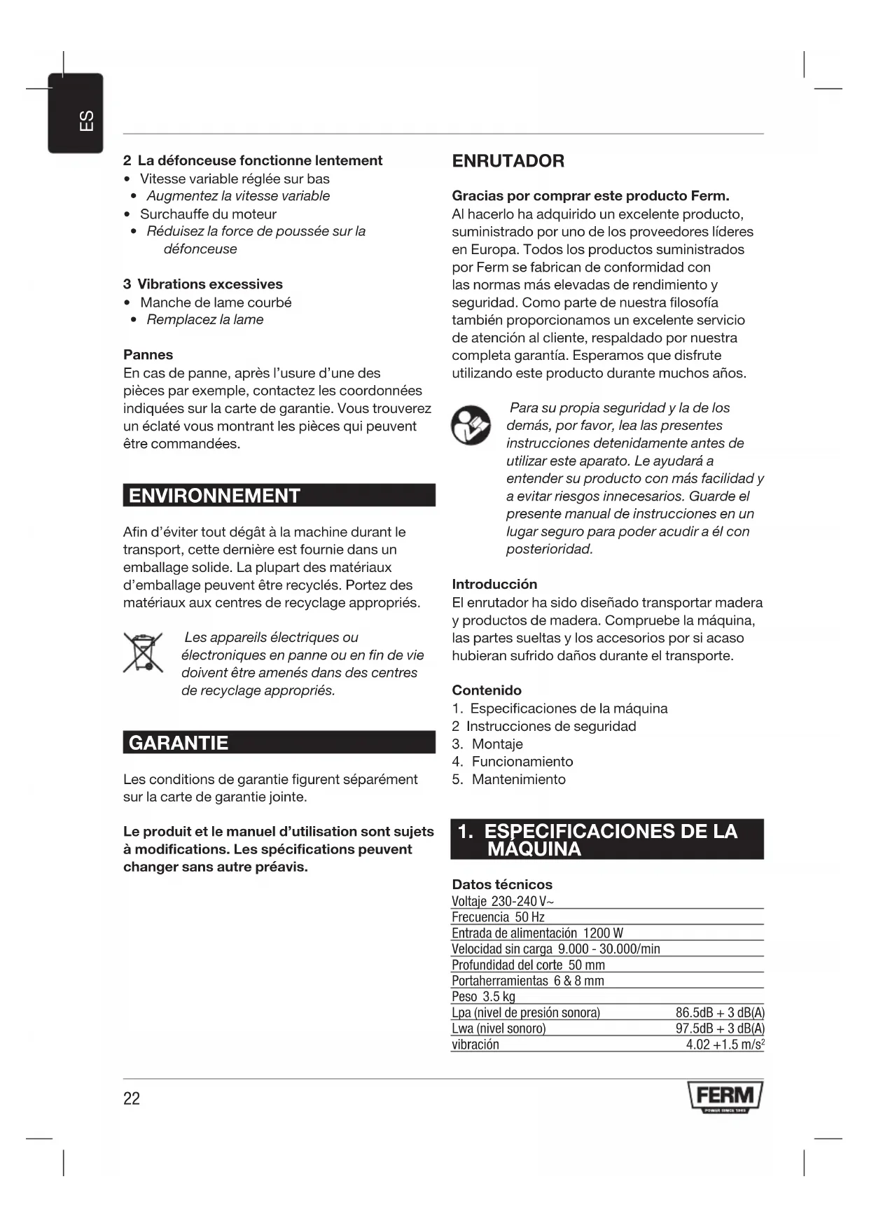 - Remplacez la lame Pannes En cas de panne, après l’usure d’une des pièces par exemple, contactez les coordonnées indiquées sur la carte de garantie. Vous trouverez un éclaté vous montrant les pièces qui peuvent être commandées. ENVIRONNEMENT Afin d’éviter tout dégât à la machine durant le transport, cette dernière est fournie dans un emballage solide. La plupart des matériaux d’emballage peuvent être recyclés. Portez des matériaux aux centres de recyclage appropriés. Les appareils électriques ou électroniques en panne ou en fin de vie doivent être amenés dans des centres de recyclage appropriés. GARANTIE Les conditions de garantie figurent séparément sur la carte de garantie jointe. Le produit et le manuel d’utilisation sont sujets à modifications. Les spécifications peuvent changer sans autre préavis. ENRUTADOR Gracias por comprar este producto Ferm. Al hacerlo ha adquirido un excelente producto, suministrado por uno de los proveedores líderes en Europa. Todos los productos suministrados por Ferm se fabrican de conformidad con las normas más elevadas de rendimiento y seguridad. Como parte de nuestra filosofía también proporcionamos un excelente servicio de atención al cliente, respaldado por nuestra completa garantía. Esperamos que disfrute utilizando este producto durante muchos años. Para su propia seguridad y la de los demás, por favor, lea las presentes instrucciones detenidamente antes de utilizar este aparato. Le ayudará a entender su producto con más facilidad y a evitar riesgos innecesarios. Guarde el presente manual de instrucciones en un lugar seguro para poder acudir a él con posterioridad. Introducción El enrutador ha sido diseñado transportar madera y productos de madera. Compruebe la máquina, las partes sueltas y los accesorios por si acaso hubieran sufrido daños durante el transporte. Contenido