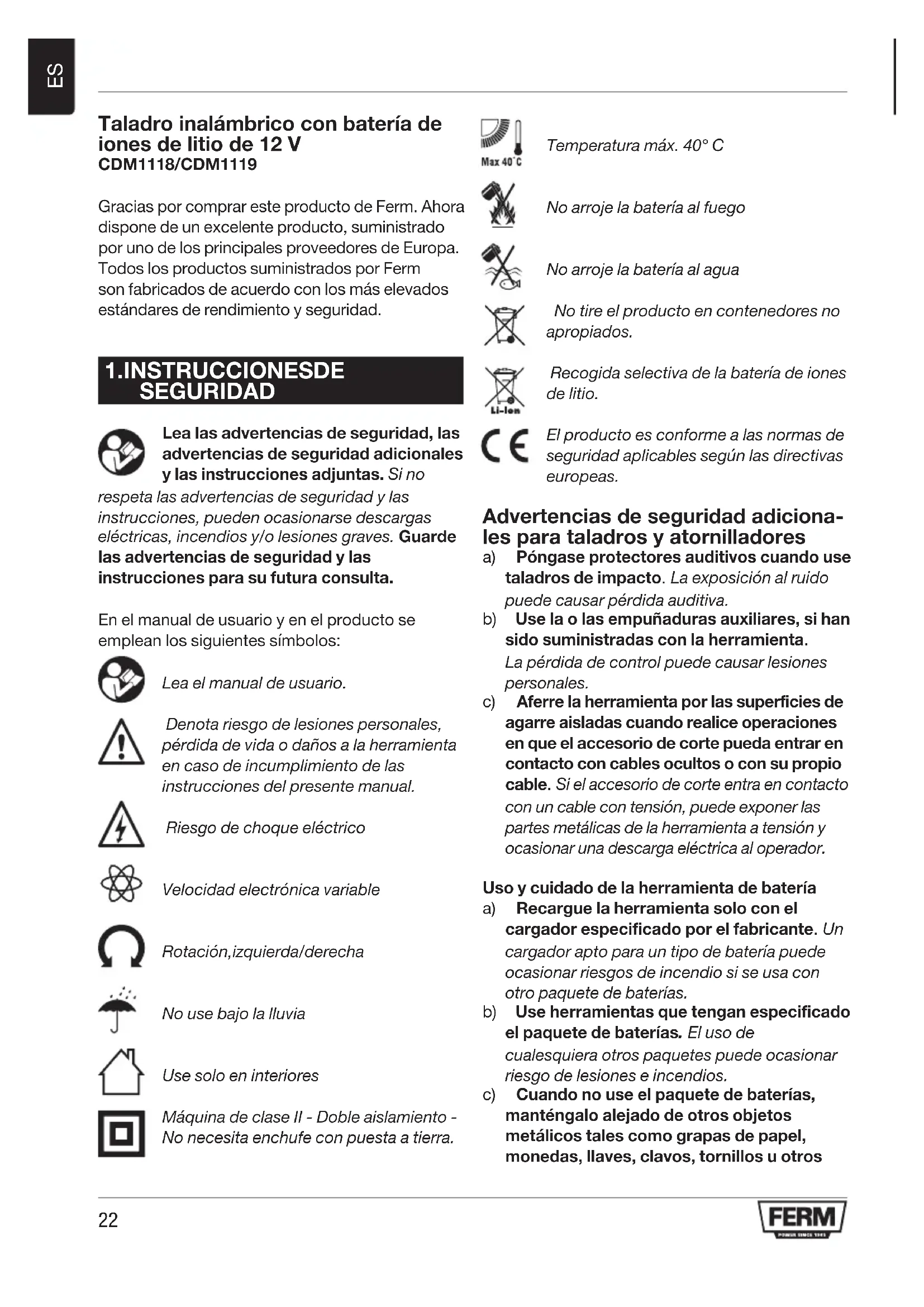 Taladro inalámbrico con batería de iones de litio de 12 V CDM1118/CDM1119 Gracias por comprar este producto de Ferm. Ahora dispone de un excelente producto, suministrado por uno de los principales proveedores de Europa. Todos los productos suministrados por Ferm son fabricados de acuerdo con los más elevados estándares de rendimiento y seguridad.