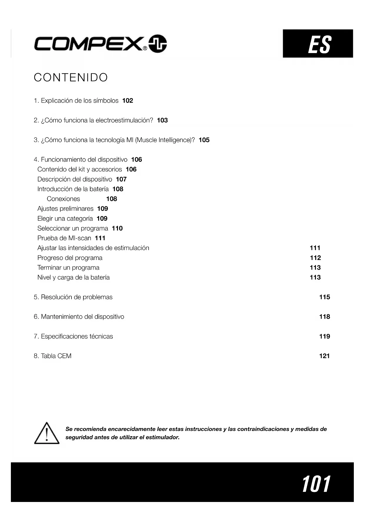 Se recomienda encarecidamente leer estas instrucciones y las contraindicaciones y medidas de seguridad antes de utilizar el estimulador.102