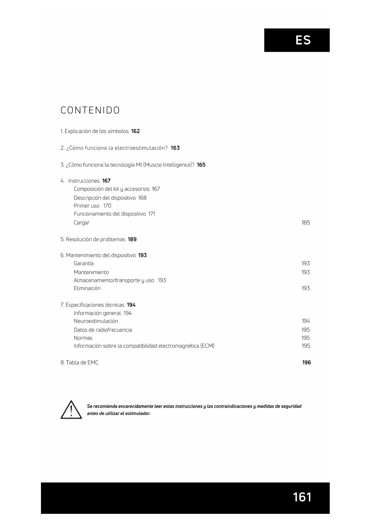 CONTENIDO Se recomienda encarecidamente leer estas instrucciones y las contraindicaciones y medidas de seguridad antes de utilizar el estimulador.