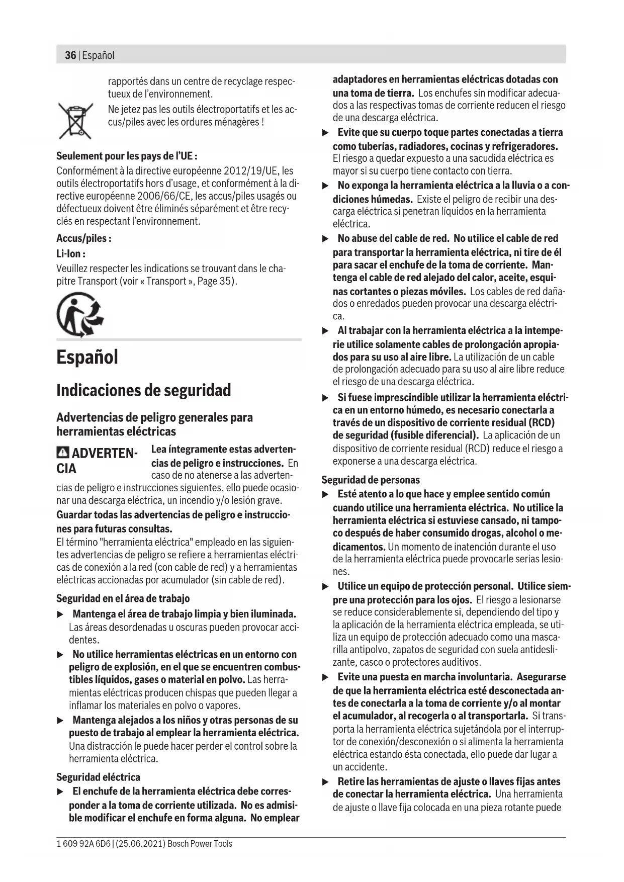 El nivel de vibraciones indicado en estas instrucciones ha si- do determinado según un procedimiento de medición nor- malizado y puede servir como base de comparación con otras herramientas eléctricas. También es adecuado para estimar provisionalmente la solicitación experimentada por las vibraciones. El nivel de vibraciones indicado ha sido determinado para las aplicaciones principales de la herramienta eléctrica. Por ello, el nivel de vibraciones puede ser diferente si la herra- mienta eléctrica se utiliza para otras aplicaciones, con útiles diferentes, o si el mantenimiento de la misma fuese deficien- te. Ello puede suponer un aumento drástico de la solicitación por vibraciones durante el tiempo total de trabajo. Para determinar con exactitud la solicitación experimentada por las vibraciones, es necesario considerar también aque- llos tiempos en los que el aparato esté desconectado, o bien, esté en funcionamiento, pero sin ser utilizado realmente. Ello puede suponer una disminución drástica de la solicita- ción por vibraciones durante el tiempo total de trabajo. Fije unas medidas de seguridad adicionales para proteger al usuario de los efectos por vibraciones, como por ejemplo: Mantenimiento de la herramienta eléctrica y de los útiles, conservar calientes las manos, organización de las secuen- cias de trabajo. Montaje Carga del acumulador u Utilice únicamente los cargadores que se enumeran en los datos técnicos. Solamente estos cargadores han sido especialmente adaptados a los acumuladores de io- nes de litio empleados en su herramienta eléctrica. Indicación: El acumulador se suministra parcialmente carga- do. Con el fin de obtener la plena potencia del acumulador, antes de su primer uso, cárguelo completamente en el carga- dor. El acumulador de iones de litio puede recargarse siempre que se quiera, sin que ello merme su vida útil. Una interrup- ción del proceso de carga no afecta al acumulador. El acumulador de iones de litio está protegido contra descar- ga total gracias al sistema de protección electrónica de cel- das "Electronic Cell Protection (ECP)". Si el acumulador está descargado, un circuito de protección se encarga de desco- nectar la herramienta eléctrica. El útil deja de moverse. u En caso de una desconexión automática de la herra- mienta eléctrica no mantenga accionado el interrup- tor de conexión/desconexión. El acumulador podría da- ñarse. Observe las indicaciones referentes a la eliminación. Desmontaje del acumulador Para la extracción del acumulador (6), presione la tecla de desenclavamiento (8) y retire el acumulador de la herra- mienta eléctrica. No proceda con brusquedad. Indicador de estado de carga El indicador de estado de carga del acumulador (5) indica, con la tecla de conexión/desconexión (4) presionada hasta la mitad o totalmente, durante unos segundos el estado de carga del acumulador y consta de 3 LEDs verdes. Diodo luminoso (LED) Capacidad 3LED verde encendido ≥ 66% 2 LED verdes encendidos 33 – 66% 1 LED verde encendido 11 – 33% 1 LED verde con lento parpadeo ≤ 10% Bosch Power Tools 1 609 92A 6D6 | (25.06.2021)42 | Español Los 3 LEDs del indicador de estado del acumulador par- padean rápidamente, si la temperatura del acumulador está fuera del margen de temperatura de servicio de –30 hasta +65°C y/o ha reaccionado la protección contra so- brecarga. Montar el dispositivo protector u Desmonte el acumulador antes de manipular la herra- mienta eléctrica (p. ej. en el mantenimiento, cambio de útil, etc.) así como al transportarla y guardarla. En caso contrario podría accidentarse al accionar fortuita- mente el interruptor de conexión/desconexión. Indicación: Tras la rotura del disco abrasivo durante el servi- cio o en caso de daño de los dispositivos de apoyo en la ca- peruza protectora/en la herramienta eléctrica, la herramien- ta eléctrica debe enviarse de inmediato al servicio técnico, ver las direcciones en el apartado "Servicio técnico y aten- ción al cliente". Cubierta protectora para amolar Coloque la cubierta protecto- ra (10) sobre el alojamiento en la herramienta eléctrica, hasta que coincidan las levas de codificación de la cubierta protectora con el alojamien- to. Presione y sujete en ello la palanca de desenclavamiento (1). Presione la cubierta protecto- ra (10) sobre el cuello del hu- sillo hasta que el collar de la cubierta protectora quede asentada en la brida de la he- rramienta eléctrica y gire la cubierta protectora, hasta que encastre de forma claramen- te audible. Adapte la posición de la caperuza protectora (10) a las nece- sidades del paso de trabajo. Para ello, presione la palanca de desenclavamiento (1) hacia arriba, y gire la cubierta pro- tectora (10) a la posición deseada. u Ajuste siempre la cubierta protectora(10) de modo que las levas de la palanca de desenclavamiento (1) encajen en las correspondientes aberturas de la cu- bierta protectora(10). u Ajuste la cubierta protectora (10) de modo que se evi- te una proyección de chispas en dirección del opera- dor. u ¡La cubierta protectora (10) sólo debe dejarse girar accionando la palanca de desenclavamiento (1) ! De lo contrario, la herramienta eléctrica no se debe seguir utilizado bajo ninguna circunstancia y debe entregar- se al servicio de atención al cliente. Indicación: Las levas de codificación en la cubierta protec- tora (10) garantizan que sólo se pueda montar una cubierta protectora adecuada para la herramienta eléctrica. Cubierta protectora para tronzar u Utilice siempre la caperuza protectora para tronzar al tronzar con medios abrasivos aglomerados (13). u En el caso de tronzar piedra, debe encargarse de una aspiración de polvo adecuada. La cubierta protectora para tronzar (13) se monta como la cubierta protectora para amolar (10). Cubierta de aspiración para tronzar con carro guía La cubierta protectora para tronzar con carro guía (24) se monta como la cubierta protectora para a