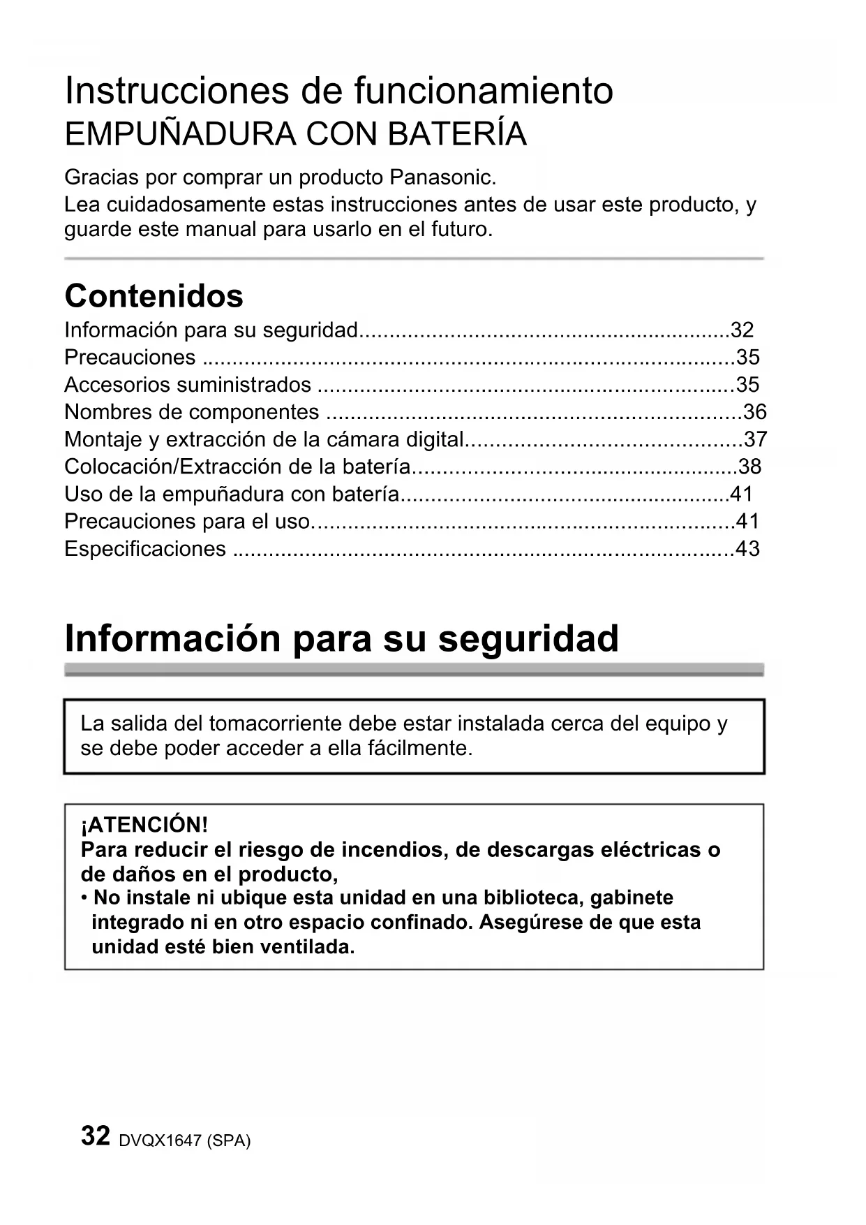 - Gracias por comprar un producto Panasonic. Lea cuidadosamente estas instrucciones antes de usar este producto, y guarde este manual para usarlo en el futuro. Contenidos Información para su seguridad p. 32