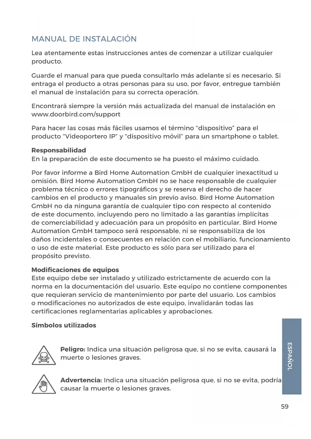 Lea atentamente estas instrucciones antes de comenzar a utilizar cualquier producto. Guarde el manual para que pueda consultarlo más adelante si es necesario. Si entraga el producto a otras personas para su uso, por favor, entregue también el manual de instalación para su correcta operación. Encontrará siempre la versión más actualizada del manual de instalación en www.doorbird.com/support Para hacer las cosas más fáciles usamos el término “dispositivo” para el producto “Videoportero IP” y “dispositivo móvil” para un smartphone o tablet. Responsabilidad En la preparación de este documento se ha puesto el máximo cuidado. Por favor informe a Bird Home Automation GmbH de cualquier inexactitud u omisión. Bird Home Automation GmbH no se hace responsable de cualquier problema técnico o errores tipográficos y se reserva el derecho de hacer cambios en el producto y manuales sin previo aviso. Bird Home Automation GmbH no da ninguna garantía de cualquier tipo con respecto al contenido de este documento, incluyendo pero no limitado a las garantías implícitas de comerciabilidad y adecuación para un propósito en particular. Bird Home Automation GmbH tampoco será responsable, ni se responsabiliza de los daños incidentales o consecuentes en relación con el mobiliario, funcionamiento o uso de este material. Este producto es sólo para ser utilizado para el propósito previsto. Modificaciones de equipos Este equipo debe ser instalado y utilizado estrictamente de acuerdo con la norma en la documentación del usuario. Este equipo no contiene componentes que requieran servicio de mantenimiento por parte del usuario. Los cambios o modificaciones no autorizados de este equipo, invalidarán todas las certificaciones reglamentarias aplicables y aprobaciones. Símbolos utilizados Peligro: Indica una situación peligrosa que, si no se evita, causará la muerte o lesiones graves. Advertencia: Indica una situación peligrosa que, si no se evita, podría causar la muerte o lesiones graves.60 Información sobre posibles peligros Precaución: Indica una situación peligrosa que, si no se evita, puede resultar en lesiones leves o moderadas. Aviso: Indica una situación que, si no se evita, podría resultar en daños a la propiedad. Importante: Indica información importante y esencial para que el producto funcione correctamente. Nota: Indica información útil que ayuda a sacar el máximo provecho del producto. A V I S O ∙ Los trabajos de montaje, instalación y mantenimiento en aparatos eléctricos sólo pueden ser realizados por personal cualificado. La inobservancia de este reglamento puede ocasionar daños graves a la salud o lesiones mortales por descargas eléctricas. ∙ Dispositivos con conexión 110-240 V: El dispositivo sólo puede conectarse a una toma de corriente de fácil acceso. En caso de peligro, se debe extraer el enchufe de corriente. ∙ Para la alimentación de corriente, utilice únicamente el adaptador de corriente enchufable original suministrado con el dispositivo o un PoE-Switch/PoE-Injector recomendado, tal como se especifica en este manual. ∙ Debido a la carga electrostática, el contacto directo con la placa de circuitos puede provocar la destrucción del dispositivo. Por lo tanto, debe evitarse en todo momento el contacto directo con la placa de circuitos. ∙ Observar la norma EN 60065 resp. EN 60950 resp. Norma EN 62368. ∙ No utilice el aparato si hay signos de daños en la carcasa, los elementos de mando o las tomas de corriente, por ejemplo, o si presenta un mal funcionamiento. Si tiene alguna duda, solicite a un especialista autorizado que controle el dispositivo. ADVERTENCIA61 ESPAÑOL ∙ No abra el dispositivo. Esto anula la garantía del dispositivo. El dispositivo no contiene ninguna pieza que pueda ser manipulada por el usuario. En caso de que se produzca un error, haga revisar el dispositivo por un experto autorizado. ∙ Por razones de seguridad, aprobación y licencia (CE/FCC/IC, etc.), no se permite el cambio y/o modificación no autorizada del dispositivo. ∙ El dispositivo no es un juguete; no permita que los niños jueguen con él. No deje el material de embalaje tirado por ahí. Las películas/ bolsas plásticas, piezas de poliestireno, etc. pueden ser peligrosas en las manos de un niño. ∙ Coloque siempre los cables de tal manera que no se conviertan en un riesgo para las personas y los animales domésticos. ∙ El voltaje se aplica a las piezas dentro del equipo. No toque ninguna pieza que no esté asociada con la instalación, cableado o conexión. Podría resultar en una descarga eléctrica. ∙ En aparatos que no estén marcados como resistentes a la intemperie: Mantenga el aparato lejos del agua o de cualquier otro líquido. ∙ No instale ni realice ninguna terminación de cable mientras la fuente de alimentación esté enchufada. Puede causar un choque eléctrico o dañar el dispositivo. ∙ Antes de conectar la alimentación, asegúrese de que los cables no estén cruzados o en cortocircuito. De lo contrario, podría producirse fuego o choque eléctrico. ∙ El alto voltaje puede estar presente internamente. No abra el dispositivo. Podría resultar en una descarga eléctrica. ∙ El dispositivo no es a prueba de explosión. No lo instale ni utilice cerca de gases o materiales inflamables. Podría producirse un incendio o una explosión. ∙ No instale dos fuentes de alimentación en paralelo a una sola entrada. Podría producirse un incendio o daños en el dispositivo. Asegúrese de conectar una sola fuente de alimentación al dispositivo. ADVERTENCIA62 ∙ No conecte ningún terminal del dispositivo a una línea de alimentación de AC. Podría producirse un incendio o una descarga eléctrica. ∙ Evite que el cable de AC se estropee o aplaste. Si el cable de AC está fracturado, podría producirse un incendio o una descarga eléctrica. ∙ No lo conecte o desenchufe con las manos mojadas. Podría resultar una descar