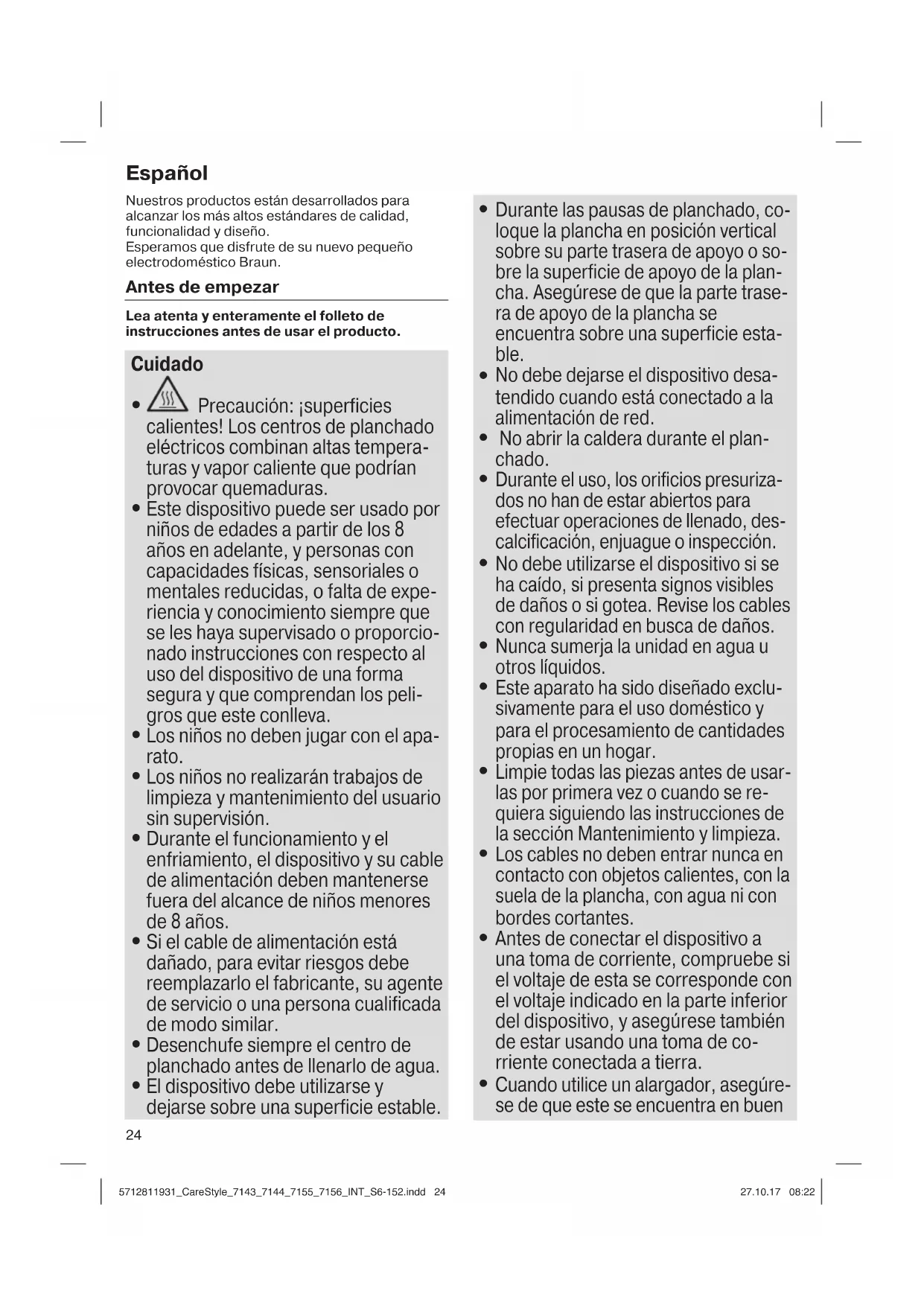 Cuando utilice un alargador, asegúre- se de que este se encuentra en buen 5712811931_CareStyle_7143_7144_7155_7156_INT_S6-152.indd 245712811931_CareStyle_7143_7144_7155_7156_INT_S6-152.indd 24 27.10.17 08:2227.10.17 08:2225 estado, de que tiene un enchufe con conexión a tierra y de que su poten- cia nominal se corresponde con la del dispositivo (16 A).