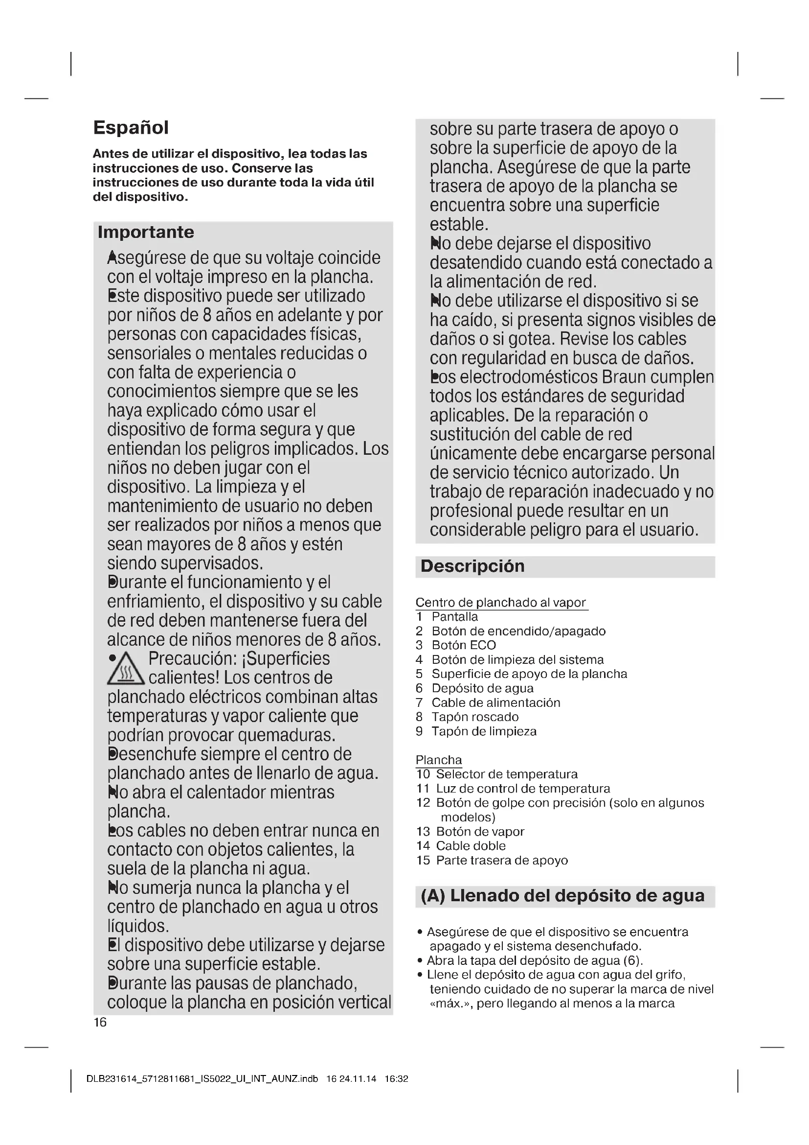Los electrodomésticos Braun cumplen todos los estándares de seguridad aplicables. De la reparación o sustitución del cable de red únicamente debe encargarse personal de servicio técnico autorizado. Un trabajo de reparación inadecuado y no profesional puede resultar en un considerable peligro para el usuario. Descripción Centro de planchado al vapor 1 Pantalla 2 Botón de encendido/apagado 3 Botón ECO 4 Botón de limpieza del sistema 5 Superficie de apoyo de la plancha 6 Depósito de agua 7 Cable de alimentación 8 Tapón roscado 9 Tapón de limpieza Plancha 10 Selector de temperatura 11 Luz de control de temperatura 12 Botón de golpe con precisión (solo en algunos modelos) 13 Botón de vapor 14 Cable doble 15 Parte trasera de apoyo (A) Llenado del depósito de agua