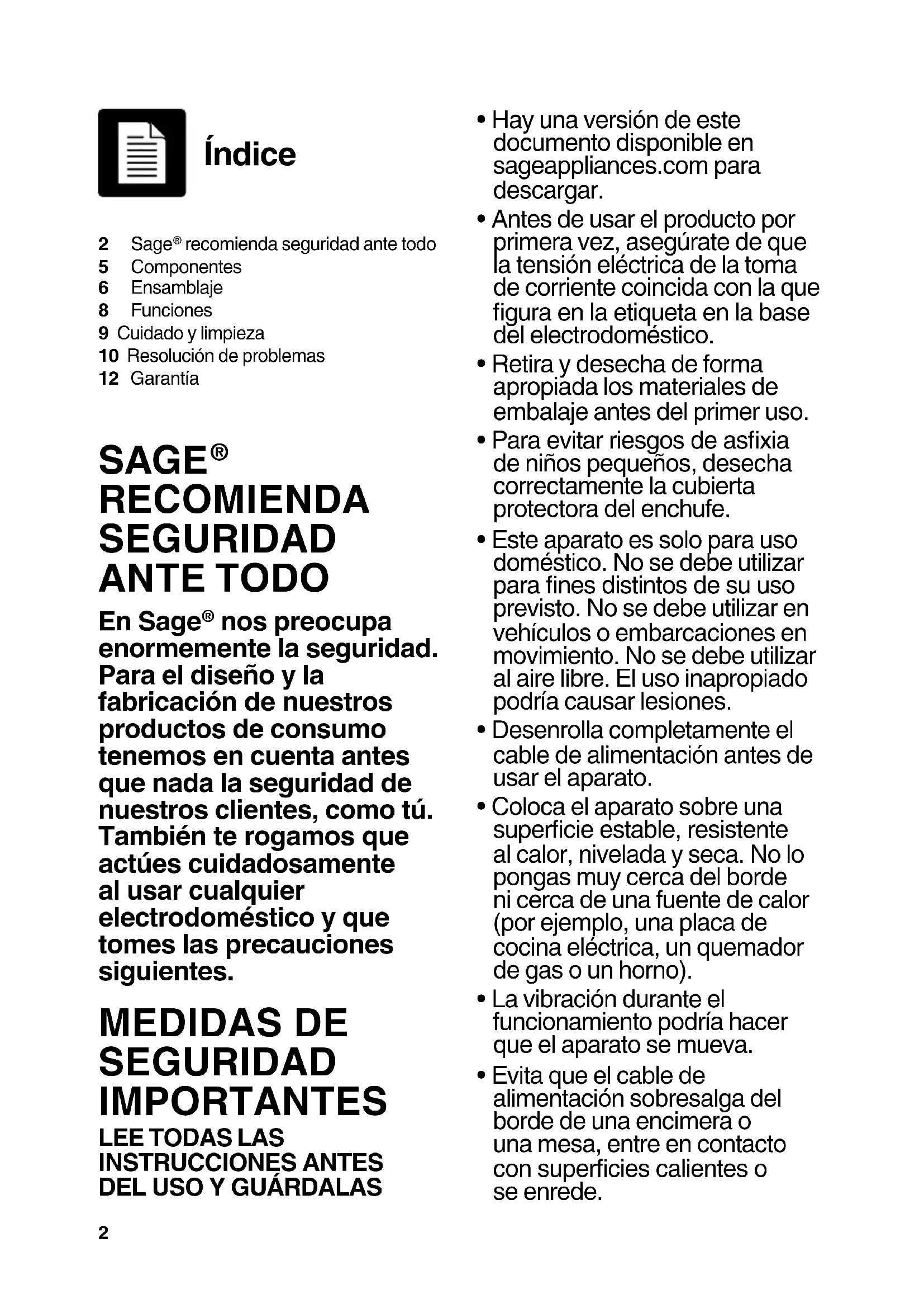ES2 2 Sage recomienda seguridad ante todo5 Componentes6 Ensamblaje8 Funciones9 Cuidado y limpieza10 Resolución de problemas12 Garantía Índice SAGE