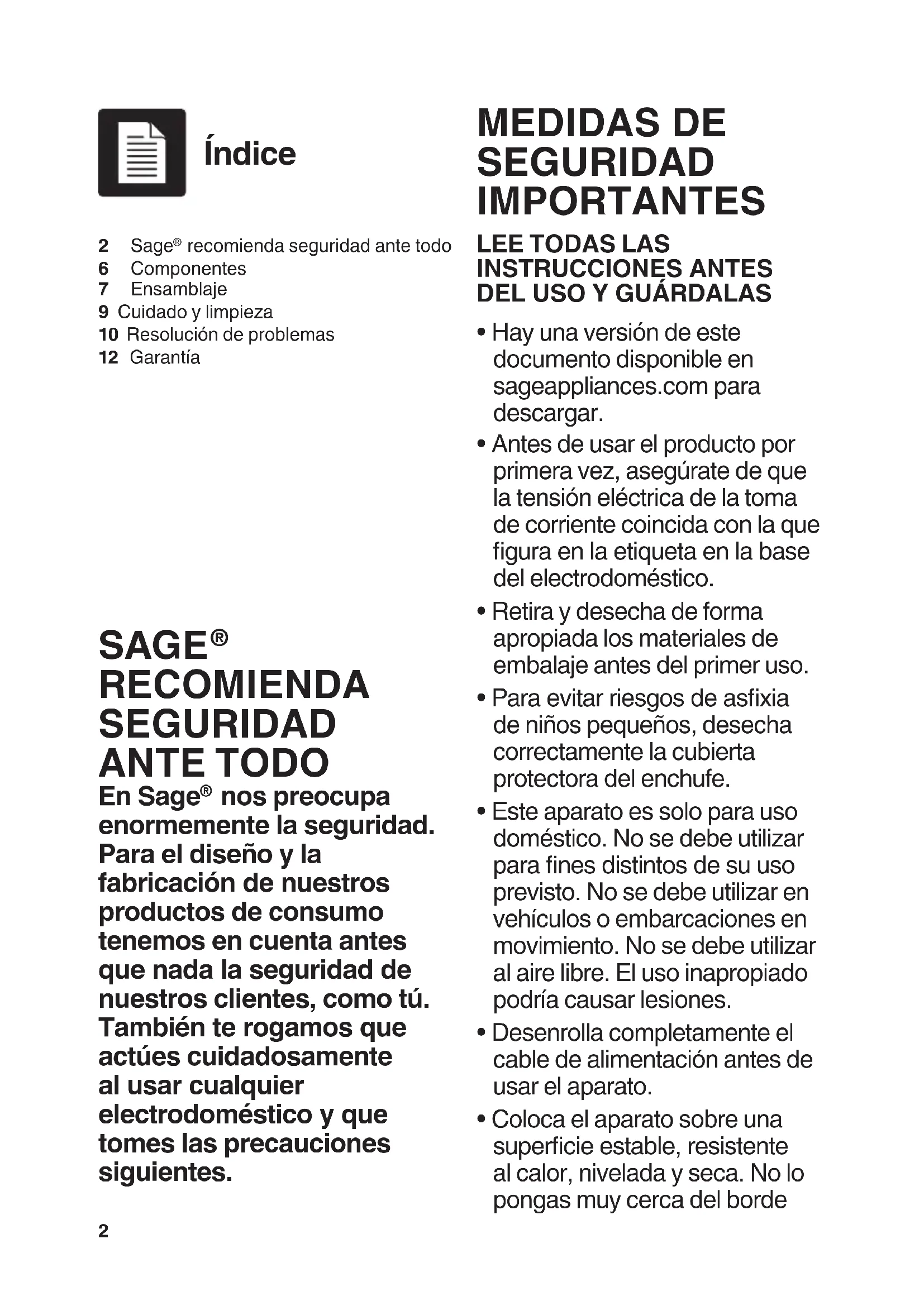 2 Sage recomienda seguridad ante todo6 Componentes7 Ensamblaje9 Cuidado y limpieza10 Resolución de problemas12 Garantía Índice SAGE