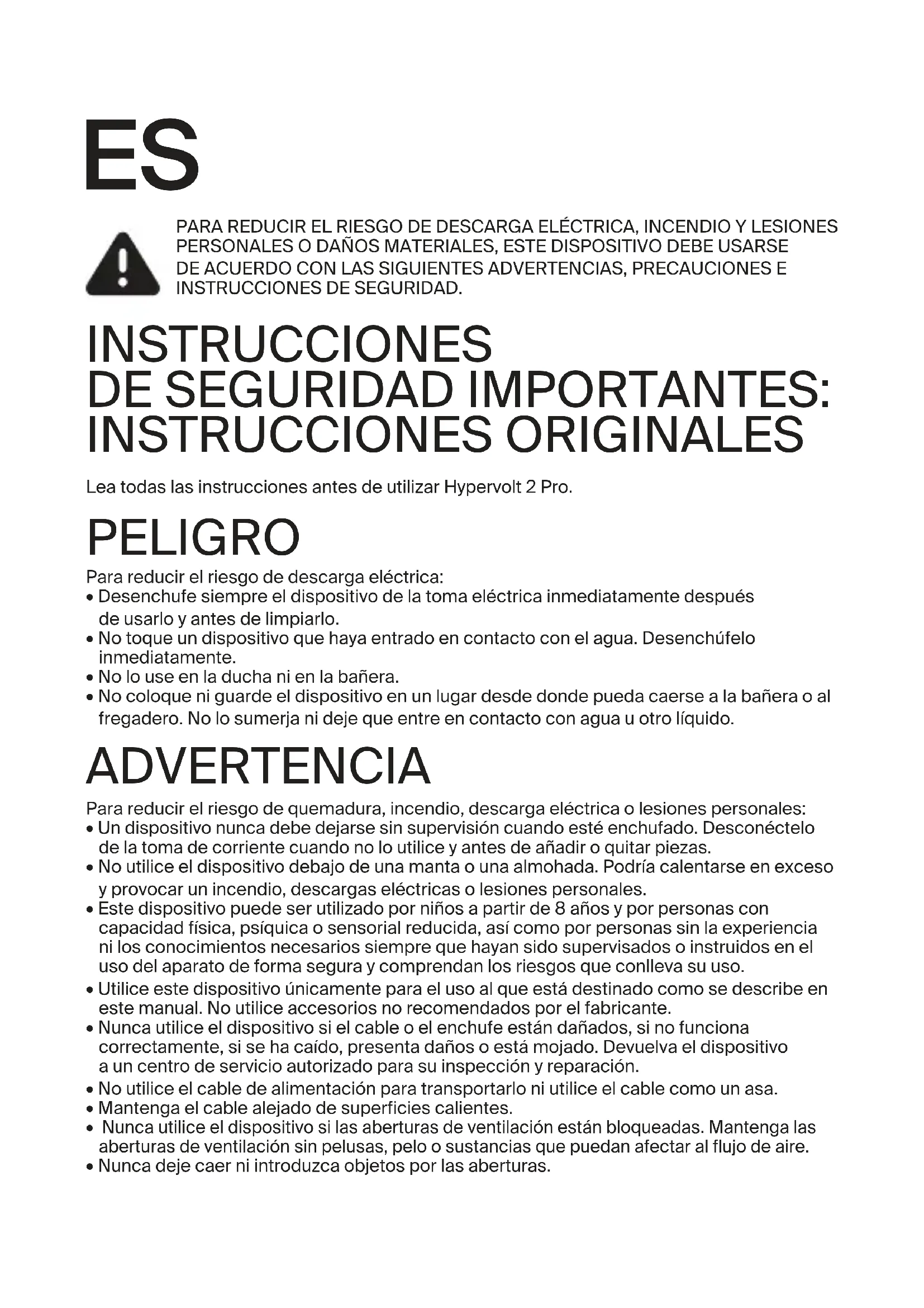 10ES PARA REDUCIR EL RIESGO DE DESCARGA ELÉCTRICA, INCENDIO Y LESIONES PERSONALES O DAÑOS MATERIALES, ESTE DISPOSITIVO DEBE USARSE DE ACUERDO CON LAS SIGUIENTES ADVERTENCIAS, PRECAUCIONES E INSTRUCCIONES DE SEGURIDAD. INSTRUCCIONES DE SEGURIDAD IMPORTANTES: INSTRUCCIONES ORIGINALES Lea todas las instrucciones antes de utilizar Hypervolt2 Pro. PELIGRO Para reducir el riesgo de descarga eléctrica: