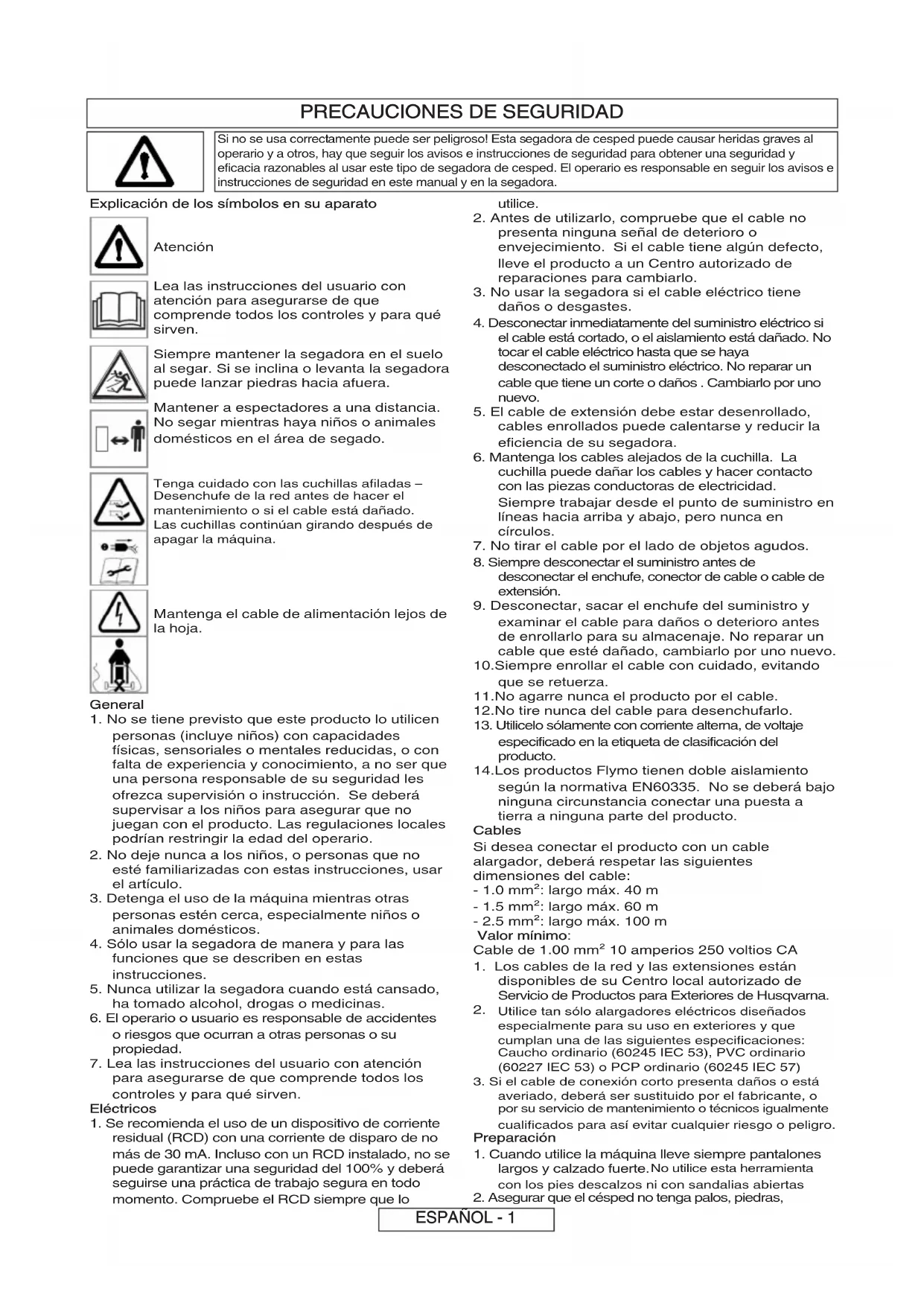 especificado en la etiqueta de clasificación del producto. 14.Los productos Flymo tienen doble aislamiento según la normativa EN60335. No se deberá bajo ninguna circunstancia conectar una puesta a tierra a ninguna parte del producto. Cables Si desea conectar el producto con un cable alargador, deberá respetar las siguientes dimensiones del cable: - 1.0 mm²: largo máx. 40 m - 1.5 mm²: largo máx. 60 m - 2.5 mm²: largo máx. 100 m Valor mínimo: Cable de 1.00 mm² 10 amperios 250 voltios CA