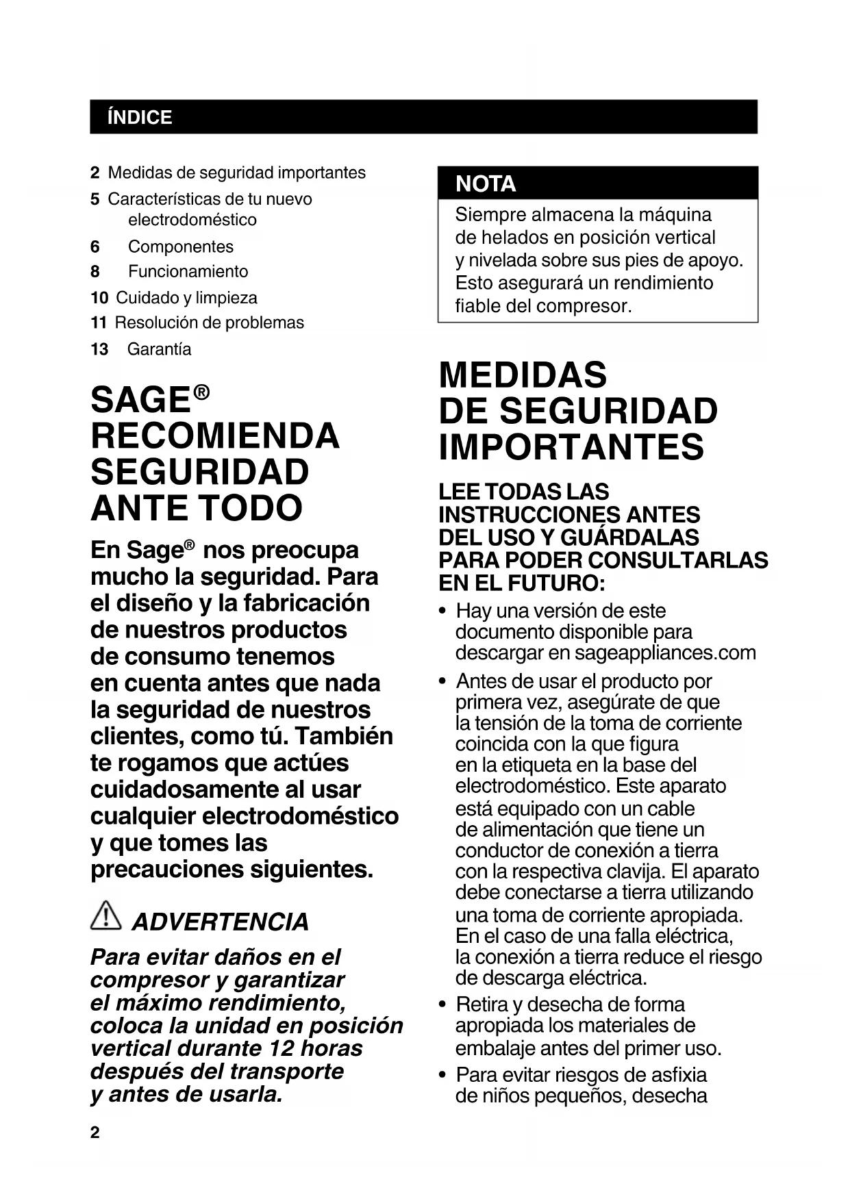 ÍNDICE2 Medidas de seguridad importantes5 Características de tu nuevo electrodoméstico6 Componentes8 Funcionamiento10 Cuidado y limpieza11 Resolución de problemas13 Garantía SAGE