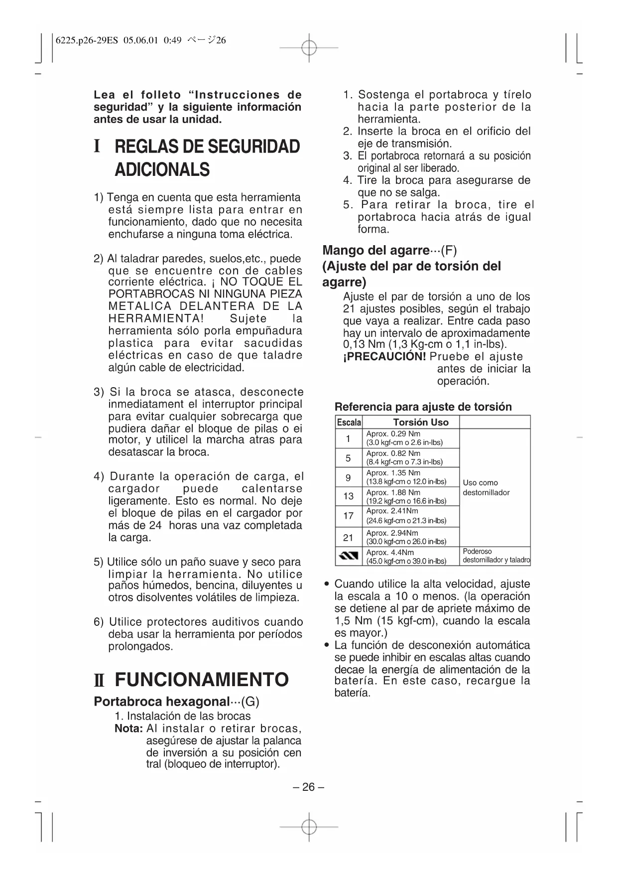 La función de desconexión automática se puede inhibir en escalas altas cuando decae la energía de alimentación de la batería. En este caso, recargue la batería. 6225.p26-29ES05.06.010:49ページ26– 27 – Nota: El diagrama es sólo una referen cia. El ajuste del par de apriete puede diferir debido a los materiales, a los tipos de tornillos, etc. Compruebe el ajuste realizado, tomando en cuenta las condiciones propias, antes de usarlo. Función de enclavamiento de la broca