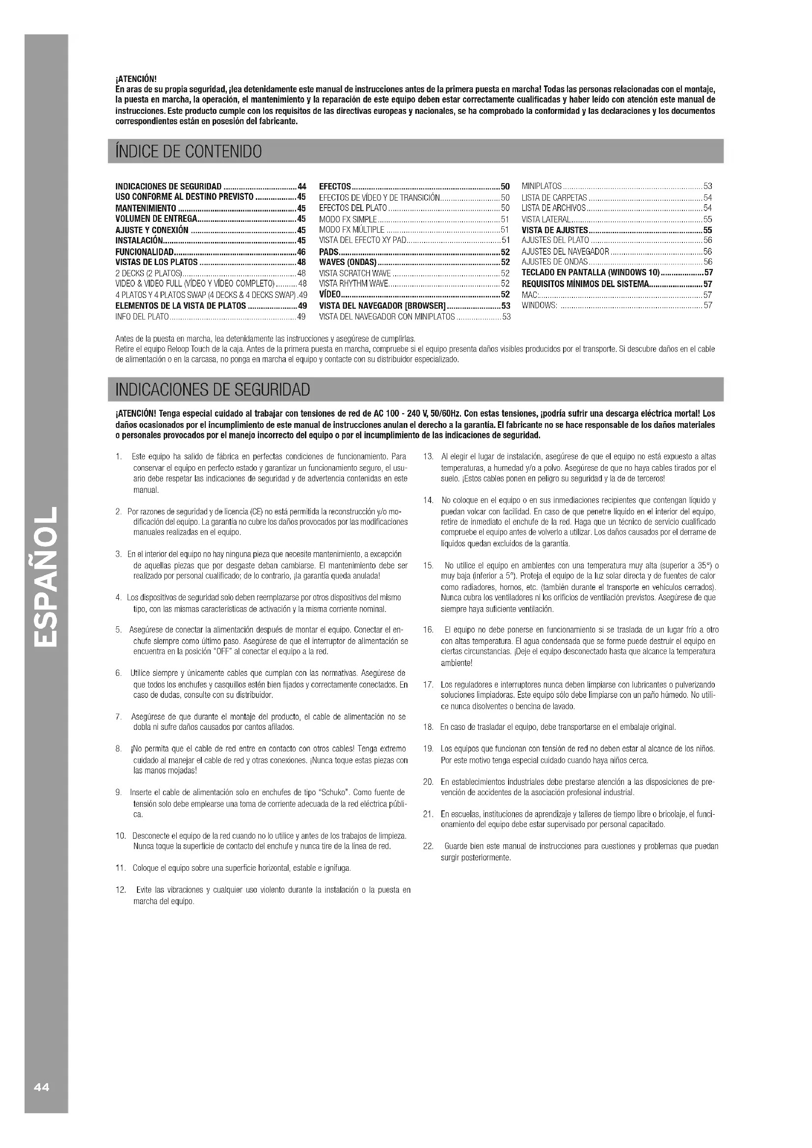 | INDICACIONES DE SEGURIDAD | 44 |