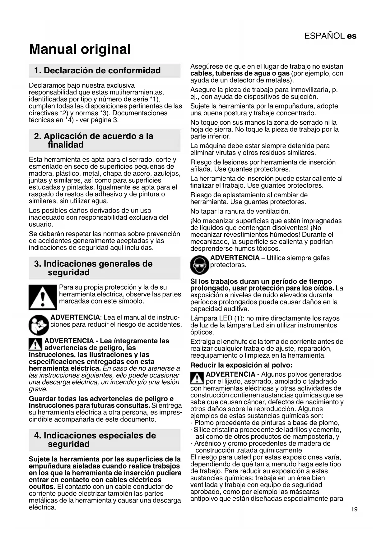 Manual original Declaramos bajo nuestra exclusiva responsabilidad que estas mutiherramientas, identificadas por tipo y número de serie *1), cumplen todas las disposiciones pertinentes de las directivas *2) y normas *3). Documentaciones técnicas en *4) - ver página 3. Esta herramienta es apta para el serrado, corte y esmerilado en seco de superficies pequeñas de madera, plástico, metal, chapa de acero, azulejos, juntas y similares, así como para superficies estucadas y pintadas. Igualmente es apta para el raspado de restos de adhesivo y de pintura o similares, sin utilizar agua. Los posibles daños derivados de un uso inadecuado son responsabilidad exclusiva del usuario. Se deberán respetar las normas sobre prevención de accidentes generalmente aceptadas y las indicaciones de seguridad aquí incluidas. Para su propia protección y la de su herramienta eléctrica, observe las partes marcadas con este símbolo. ADVERTENCIA: Lea el manual de instruc- ciones para reducir el riesgo de accidentes. ADVERTENCIA - Lea íntegramente las advertencias de peligro, las instrucciones, las ilustraciones y las especificaciones entregadas con esta herramienta eléctrica. En caso de no atenerse a las instrucciones siguientes, ello puede ocasionar una descarga eléctrica, un incendio y/o una lesión grave. Guardar todas las advertencias de peligro e instrucciones para futuras consultas. Si entrega su herramienta eléctrica a otra persona, es impres- cindible acompañarla de este documento. Sujete la herramienta por las superficies de la empuñadura aisladas cuando realice trabajos en los que la herramienta de inserción pudiera entrar en contacto con cables eléctricos ocultos. El contacto con un cable conductor de corriente puede electrizar también las partes metálicas de la herramienta y causar una descarga eléctrica. Asegúrese de que en el lugar de trabajo no existan cables, tuberías de agua o gas (por ejemplo, con ayuda de un detector de metales). Asegure la pieza de trabajo para inmovilizarla, p. ej., con ayuda de dispositivos de sujeción. Sujete la herramienta por la empuñadura, adopte una buena postura y trabaje concentrado. No toque con sus manos la zona de serrado ni la hoja de sierra. No toque la pieza de trabajo por la parte inferior. La máquina debe estar siempre detenida para eliminar virutas y otros residuos similares. Riesgo de lesiones por herramienta de inserción afilada. Use guantes protectores. La herramienta de inserción puede estar caliente al finalizar el trabajo. Use guantes protectores. Riesgo de aplastamiento al cambiar de herramienta. Use guantes protectores. No tapar la ranura de ventilación. ¡No mecanizar superficies que estén impregnadas de líquidos que contengan disolventes! ¡No mecanizar revestimientos húmedos! Durante el mecanizado, la superficie se calienta y podrían desprenderse humos tóxicos. ADVERTENCIA – Utilice siempre gafas protectoras. Si los trabajos duran un período de tiempo prolongado, usar protección para los oídos. La exposición a niveles de ruido elevados durante períodos prolongados puede causar daños en la capacidad auditiva. Lámpara LED (1): no mire directamente los rayos de luz de la lámpara Led sin utilizar instrumentos ópticos. Extraiga el enchufe de la toma de corriente antes de realizar cualquier trabajo de ajuste, reparación, reequipamiento o limpieza en la herramienta. Reducir la exposición al polvo: ADVERTENCIA - Algunos polvos generados por el lijado, aserrado, amolado o taladrado con herramientas eléctricas y otras actividades de construcción contienen sustancias químicas que se sabe que causan cáncer, defectos de nacimiento y otros daños sobre la reproducción. Algunos ejemplos de estas sustancias químicas son: - Plomo procedente de pinturas a base de plomo, - Sílice cristalina procedente de ladrillos y cemento, así como de otros productos de mampostería, y - Arsénico y cromo procedentes de madera de construcción tratada químicamente El riesgo para usted por estas exposiciones varía, dependiendo de qué tan a menudo haga este tipo de trabajo. Para reducir su exposición a estas sustancias químicas: trabaje en un área bien ventilada y trabaje con equipo de seguridad aprobado, como por ejemplo las máscaras antipolvo que están diseñadas especialmente para