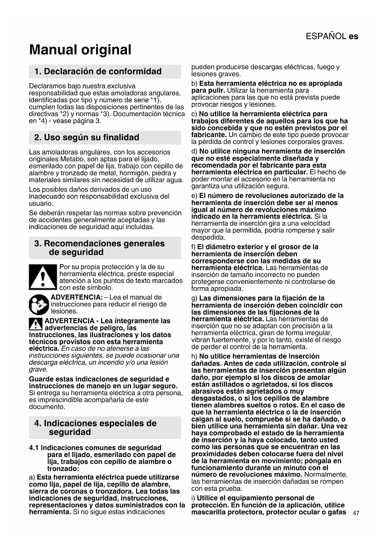 Manual original Declaramos bajo nuestra exclusiva responsabilidad que estas amoladoras angulares, identificadas por tipo y número de serie *1), cumplen todas las disposiciones pertinentes de las directivas *2) y normas *3). Documentación técnica en *4) - véase página 3. Las amoladoras angulares, con los accesorios originales Metabo, son aptas para el lijado, esmerilado con papel de lija, trabajo con cepillo de alambre y tronzado de metal, hormigón, piedra y materiales similares sin necesidad de utilizar agua. Los posibles daños derivados de un uso inadecuado son responsabilidad exclusiva del usuario. Se deberán respetar las normas sobre prevención de accidentes generalmente aceptadas y las indicaciones de seguridad aquí incluidas. Por su propia protección y la de su herramienta eléctrica, preste especial atención a los puntos de texto marcados con este símbolo. ADVERTENCIA: – Lea el manual de instrucciones para reducir el riesgo de lesiones. ADVERTENCIA - Lea íntegramente las advertencias de peligro, las instrucciones, las ilustraciones y los datos técnicos provistos con esta herramienta eléctrica. En caso de no atenerse a las instrucciones siguientes, se puede ocasionar una descarga eléctrica, un incendio y/o una lesión grave. Guarde estas indicaciones de seguridad e instrucciones de manejo en un lugar seguro. Si entrega su herramienta eléctrica a otra persona, es imprescindible acompañarla de este documento.