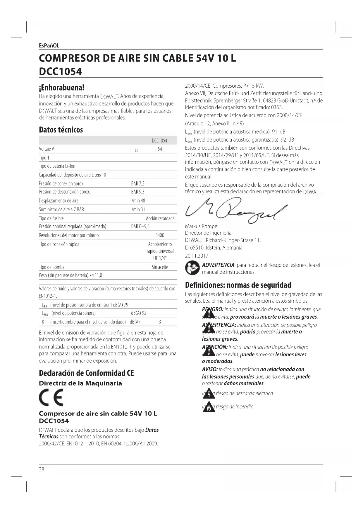 (nivel de potencia sonora) dB(A) 92 K (incertidumbre para el nivel de sonido dado) dB(A) 3 El nivel de emisión de vibración que figura en esta hoja de información se ha medido de conformidad con una prueba normalizada proporcionada en la EN1012‑1 y puede utilizarse para comparar una herramienta con otra. Puede usarse para una evaluación preliminar deexposición. Declaración de Conformidad CE Directriz de la Maquinaria Compresor de aire sin cable 54V 10 L DCC1054 DeWALT declara que los productos descritos bajo Datos Técnicos son conformes a las normas: 2006/42/CE, EN1012‑1:2010, EN 60204‑1:2006/A1:2009. COMPRESOR DE AIRE SIN CABLE 54V 10 L DCC1054 Español (traducido de las instrucciones originales)39 EsPañOL