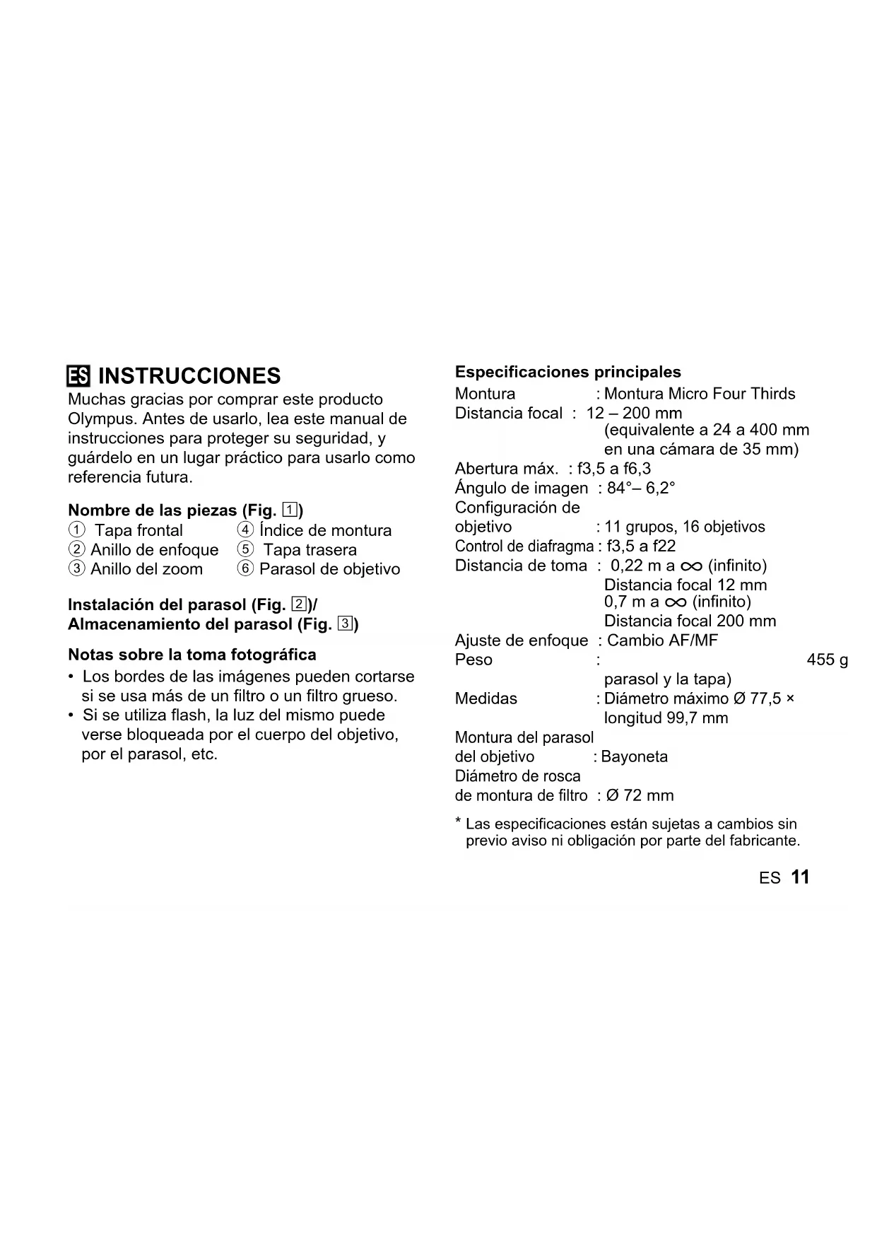 - ES 11 INSTRUCCIONES Muchas gracias por comprar este producto Olympus. Antes de usarlo, lea este manual de instrucciones para proteger su seguridad, y guárdelo en un lugar práctico para usarlo como referencia futura. Nombre de las piezas (Fig. 1) 1 Tapa frontal 2 Anillo de enfoque 3 Anillo del zoom 4 Índice de montura 5 Tapa trasera 6 Parasol de objetivo Instalación del parasol (Fig. 2)/ Almacenamiento del parasol (Fig. 3) Notas sobre la toma fotográfica