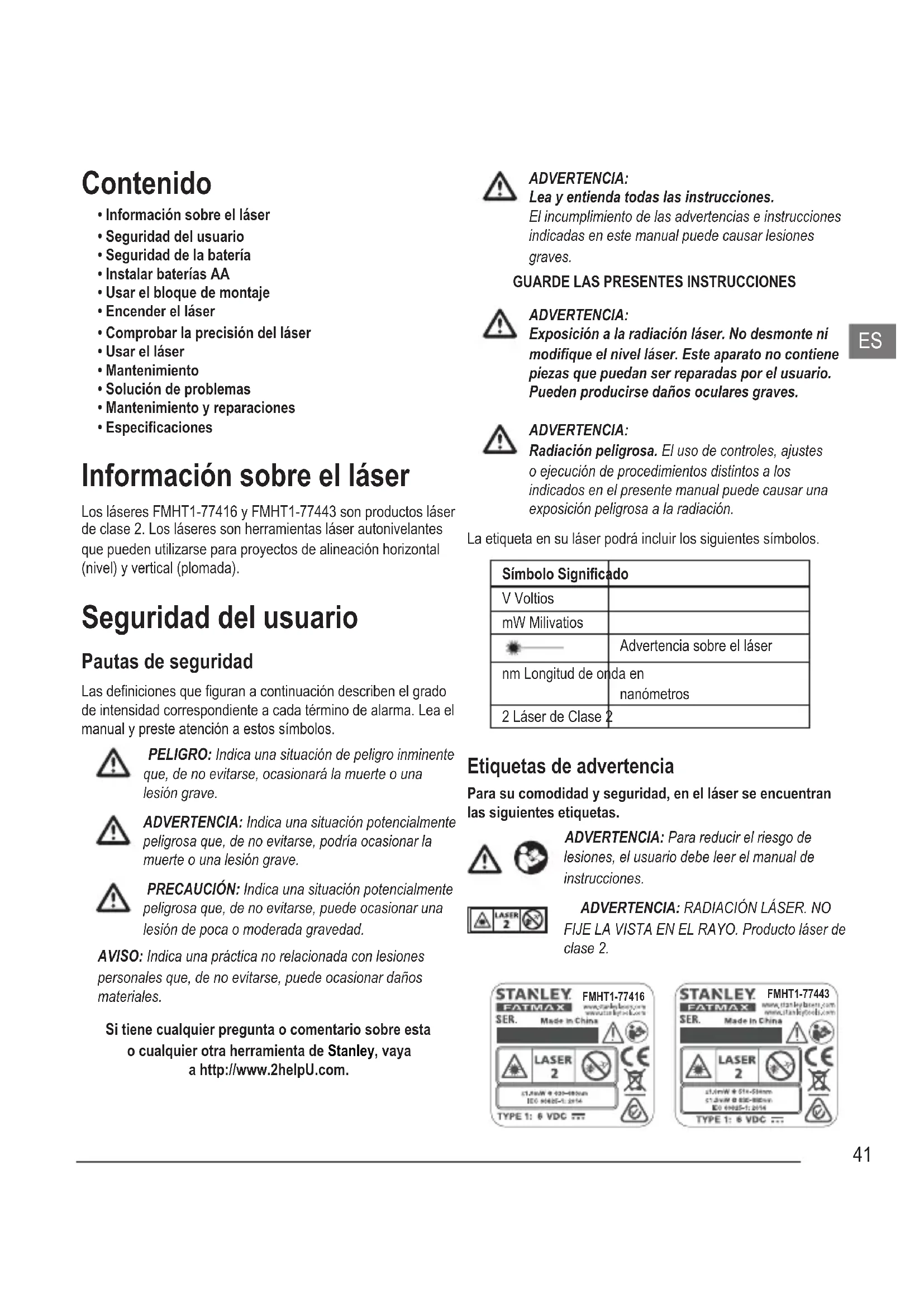 - Especicaciones Información sobre el láser Los láseres FMHT1-77416 y FMHT1-77443 son productos láser de clase 2. Los láseres son herramientas láser autonivelantes que pueden utilizarse para proyectos de alineación horizontal (nivel) y vertical (plomada). Seguridad del usuario Pautas de seguridad Las deniciones que guran a continuación describen el grado de intensidad correspondiente a cada término de alarma. Lea el manual y preste atención a estos símbolos. PELIGRO: Indica una situación de peligro inminente que, de no evitarse, ocasionará la muerte o una lesión grave. ADVERTENCIA: Indica una situación potencialmente peligrosa que, de no evitarse, podría ocasionar la muerte o una lesión grave. PRECAUCIÓN: Indica una situación potencialmente peligrosa que, de no evitarse, puede ocasionar una lesión de poca o moderada gravedad. AVISO: Indica una práctica no relacionada con lesiones personales que, de no evitarse, puede ocasionar daños materiales. Si tiene cualquier pregunta o comentario sobre esta o cualquier otra herramienta de Stanley, vaya a http://www.2helpU.com. ADVERTENCIA: Lea y entienda todas las instrucciones. El incumplimiento de las advertencias e instrucciones indicadas en este manual puede causar lesiones graves.