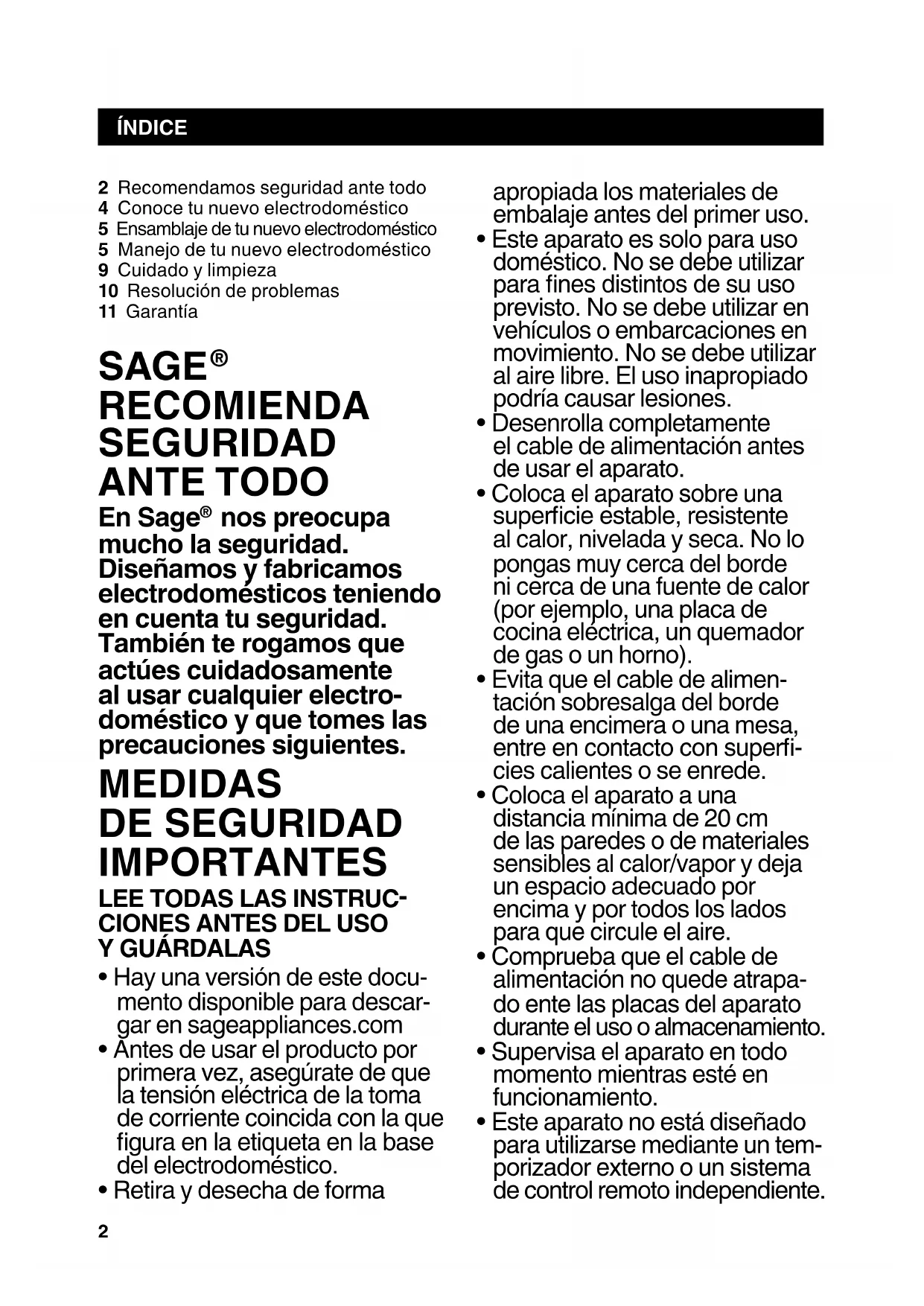En Sage® nos preocupa mucho la seguridad. Disénamos y fabricamos electrodomesticos tenerdo en cuenta tucurity. también te rogamos que actues@cuidadosamente al usarrialquier electrodomestico y que tomes las precauiones siguentes.