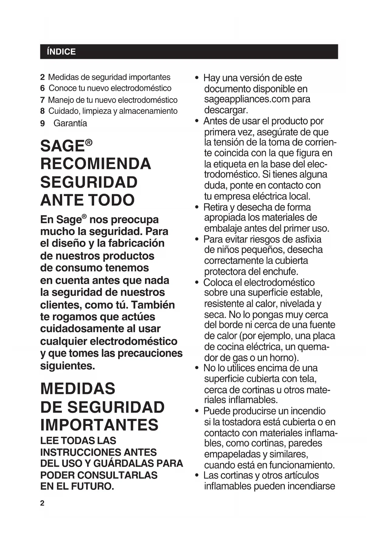 ÍNDICE Medidas de seguridad importantes6 Conoce tu nuevo electrodoméstico Manejo de tu nuevo electrodoméstico8 Cuidado, limpieza y almacenamiento9 Garantía SAGE