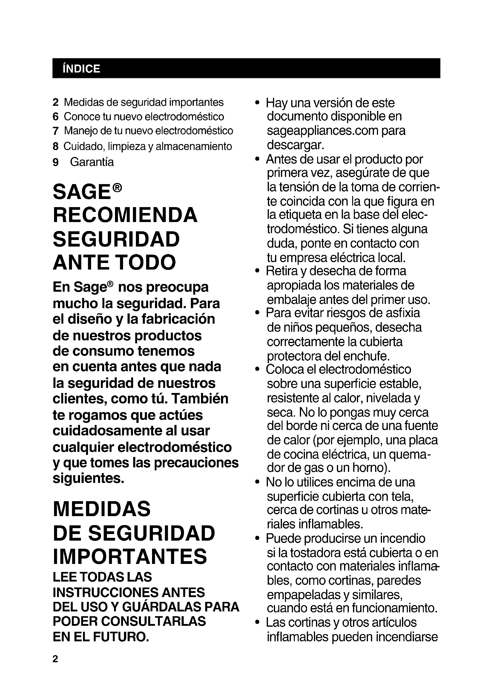 En Sage® nos preocupa mucho la seguridad. Para el Diseño y la fabricación de nuestros productos de consumo tenemos encuenta antes que nada lacuritydenueros clients, como tu. Internacional te rogamos que actues cuidadosamente al usarrialquier electrodoméstico y que tomes las precauiones seguides.