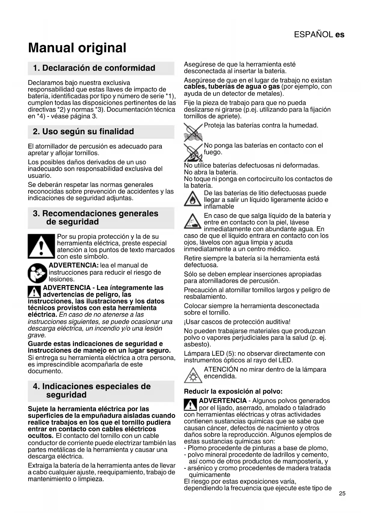Manual original Declaramos bajo nuestra exclusiva responsabilidad que estas llaves de impacto de batería, identificadas por tipo y número de serie *1), cumplen todas las disposiciones pertinentes de las directivas *2) y normas *3). Documentación técnica en *4) - véase página 3. El atornillador de percusión es adecuado para apretar y aflojar tornillos. Los posibles daños derivados de un uso inadecuado son responsabilidad exclusiva del usuario. Se deberán respetar las normas generales reconocidas sobre prevención de accidentes y las indicaciones de seguridad adjuntas. Por su propia protección y la de su herramienta eléctrica, preste especial atención a los puntos de texto marcados con este símbolo. ADVERTENCIA: lea el manual de instrucciones para reducir el riesgo de lesiones. ADVERTENCIA - Lea íntegramente las advertencias de peligro, las instrucciones, las ilustraciones y los datos técnicos provistos con esta herramienta eléctrica. En caso de no atenerse a las instrucciones siguientes, se puede ocasionar una descarga eléctrica, un incendio y/o una lesión grave. Guarde estas indicaciones de seguridad e instrucciones de manejo en un lugar seguro. Si entrega su herramienta eléctrica a otra persona, es imprescindible acompañarla de este documento. Sujete la herramienta eléctrica por las superficies de la empuñadura aisladas cuando realice trabajos en los que el tornillo pudiera entrar en contacto con cables eléctricos ocultos. El contacto del tornillo con un cable conductor de corriente puede electrizar también las partes metálicas de la herramienta y causar una descarga eléctrica. Extraiga la batería de la herramienta antes de llevar a cabo cualquier ajuste, reequipamiento, trabajo de mantenimiento o limpieza. Asegúrese de que la herramienta esté desconectada al insertar la batería. Asegúrese de que en el lugar de trabajo no existan cables, tuberías de agua o gas (por ejemplo, con ayuda de un detector de metales). Fije la pieza de trabajo para que no pueda deslizarse ni girarse (p.ej. utilizando para la fijación tornillos de apriete). Proteja las baterías contra la humedad. No ponga las baterías en contacto con el fuego. No utilice baterías defectuosas ni deformadas. No abra la batería. No toque ni ponga en cortocircuito los contactos de la batería. De las baterías de litio defectuosas puede llegar a salir un líquido ligeramente ácido e inflamable En caso de que salga líquido de la batería y entre en contacto con la piel, lávese inmediatamente con abundante agua. En caso de que el líquido entrara en contacto con los ojos, lávelos con agua limpia y acuda inmediatamente a un centro médico. Retire siempre la batería si la herramienta está defectuosa. Sólo se deben emplear inserciones apropiadas para atornilladores de percusión. Precaución al atornillar tornillos largos y peligro de resbalamiento. Colocar siempre la herramienta desconectada sobre el tornillo. ¡Usar cascos de protección auditiva! No pueden trabajarse materiales que produzcan polvo o vapores perjudiciales para la salud (p. ej. asbesto). Lámpara LED (5): no observar directamente con instrumentos ópticos al rayo del LED. ATENCIÓN no mirar dentro de la lámpara encendida. Reducir la exposición al polvo: ADVERTENCIA - Algunos polvos generados por el lijado, aserrado, amolado o taladrado con herramientas eléctricas y otras actividades contienen sustancias químicas que se sabe que causan cáncer, defectos de nacimiento y otros daños sobre la reproducción. Algunos ejemplos de estas sustancias químicas son: - Plomo procedente de pinturas a base de plomo, - polvo mineral procedente de ladrillos y cemento, así como de otros productos de mampostería, y - arsénico y cromo procedentes de madera tratada químicamente El riesgo por estas exposiciones varía, dependiendo la frecuencia que ejecute este tipo de