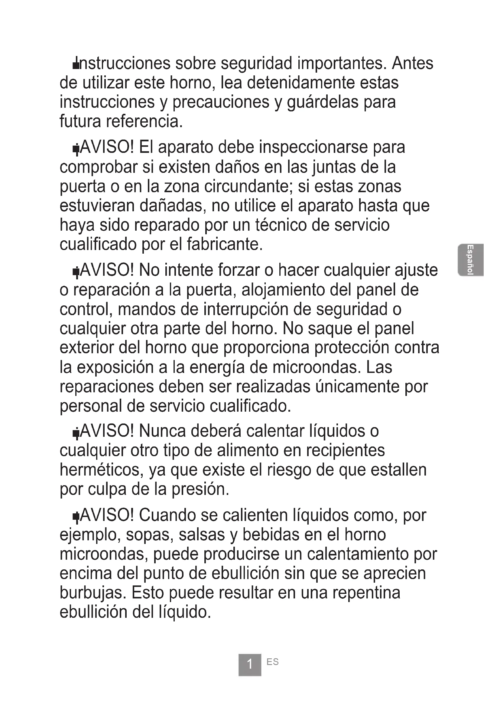 ¡AVISO! No intente forzar o hacer cualquier ajuste o reparación a la puerta, alojamiento del panel de control, mandos de interrupción de seguridad o cualquier otra parte del horno. No saque el panel exterior del horno que proporciona protección contra la exposición a la energía de microondas. Las reparaciones deben ser realizadas únicamente por personal de servicio cualicado.