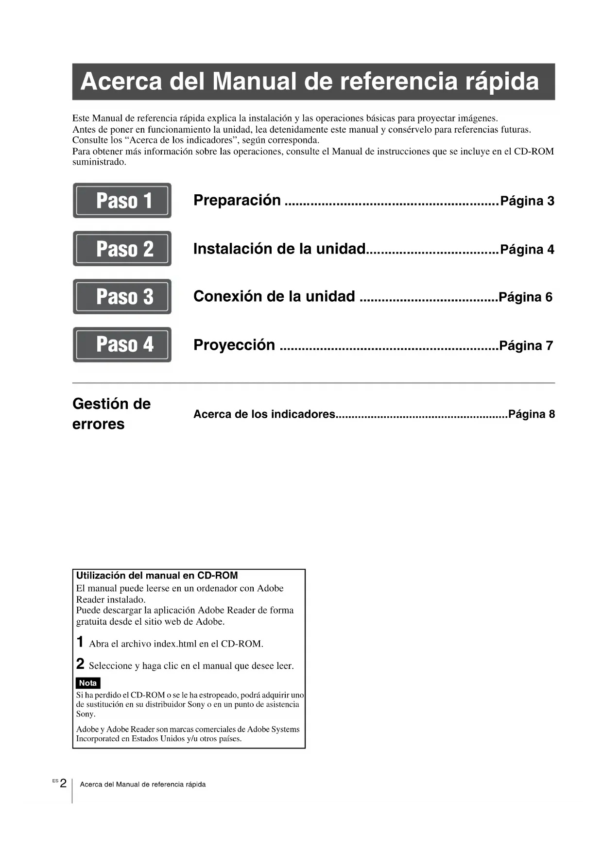 Este Manual de referencia rápida explica la instalación y las operaciones básicas para proyectar imágenes.Antes de poner en funcionamiento la unidad, lea detenidamente este manual y consérvelo para referencias futuras.Consulte los “Acerca de los indicadores”, según corresponda.Para obtener más información sobre las operaciones, consulte el Manual de instrucciones que se incluye en el CD-ROM suministrado. Acerca del Manual de referencia rápida Preparación ..........................................................Página 3 Instalación de la unidad....................................Página 4 Conexión de la unidad ......................................Página 6 Proyección ............................................................Página 7 Gestión de errores Acerca de los indicadores......................................................Página 8 Paso 1 Paso 2 Paso 3 Paso 4 Utilización del manual en CD-ROMEl manual puede leerse en un ordenador con Adobe Reader instalado.Puede descargar la aplicación Adobe Reader de forma gratuita desde el sitio web de Adobe. 1 Abra el archivo index.html en el CD-ROM. 2 Seleccione y haga clic en el manual que desee leer. Si ha perdido el CD-ROM o se le ha estropeado, podrá adquirir uno de sustitución en su distribuidor Sony o en un punto de asistencia Sony.Adobe y Adobe Reader son marcas comerciales de Adobe Systems Incorporated en Estados Unidos y/u otros países. NotaPreparación
